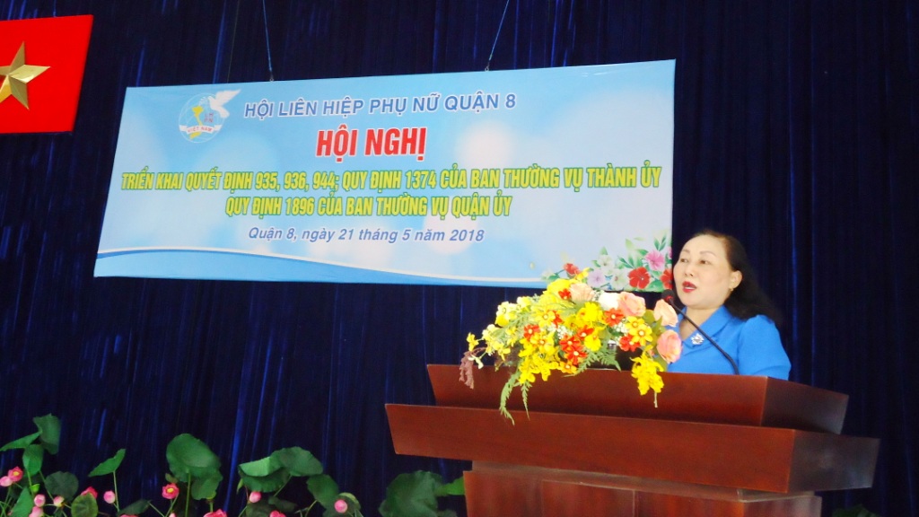 Chiều ngày 21/5/2018 tại Hội trường Mặt trận, các đoàn thể Quận 8, Hội LHPN Quận đã triển khai những nội dung cơ bản của 3 Quyết định số 935-QĐ/TU ngày 28/4/2017 về việc ban hành Quy chế tiếp xúc, đối thoại trực tiếp giữa người đứng đầu cấp ủy, người đứng đầu chính quyền các cấp với nhân dân trên địa bàn thành phố Hồ Chí Minh, Quyết định số 936-QĐ/TU ngày 28/4/2017 về ban hành Quy định về trách nhiệm của cấp ủy, tổ chức đảng, chính quyền, cán bộ, đảng viên, công chức, viên chức tiếp thu ý kiến góp ý của Mặt trận Tổ quốc, các tổ chức chính trị - xã hội và nhân dân tham gia góp ý xây dựng Đảng, xây dựng chính quyền; Quyết định số 994-QĐ/TU ngày 25/5/2017 về việc ban hành Quy chế lấy ý kiến nhân dân thông qua Mặt trận Tổ quốc Việt Nam, các tổ chức chính trị - xã hội và các cơ quan có liên quan góp ý các chủ trương, chính sách của cấp ủy và chính quyền các cấp trước khi ban hành của Ban Thường vụ Thành ủy; Quy định 1374 của Ban Thường vụ Thành ủy và Quy định 1896 của Ban Thường vụ Quận ủy về ban hành Quy trình giải quyết thông tin phản ánh liên quan các tập thể, cá nhân suy thoái về tư tưởng chính trị, đạo đức lối sống, vi phạm quy định của Đảng, pháp luật của Nhà nước do đồng chí Trần Thị Như Phương – Nguyên Trưởng Ban Chính sách Luật pháp Hội LHPN Thành phố là báo cáo viên với sự tham dự của 236 cán bộ, hội viên là thành viên Ban Chấp hành Hội LHPN Quận và 21 cơ sở Hội, Chi hội trưởng, phó của 97 Chi hội phụ nữ khu phố trên địa bàn quận.