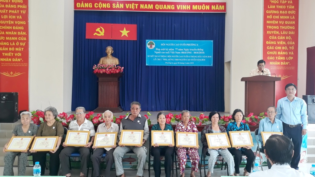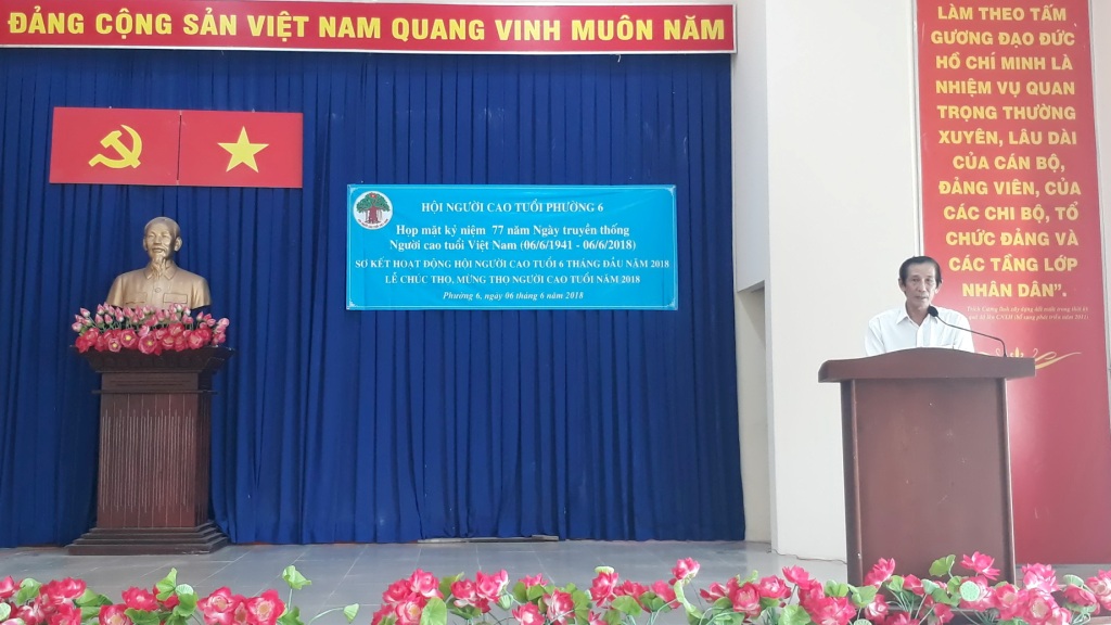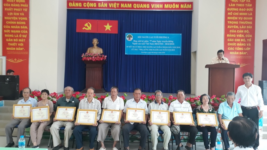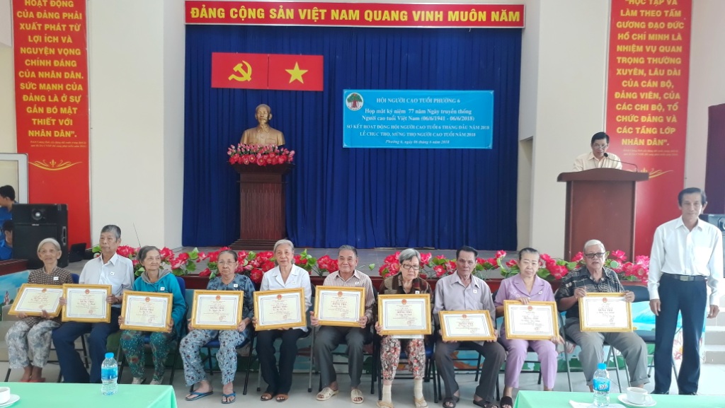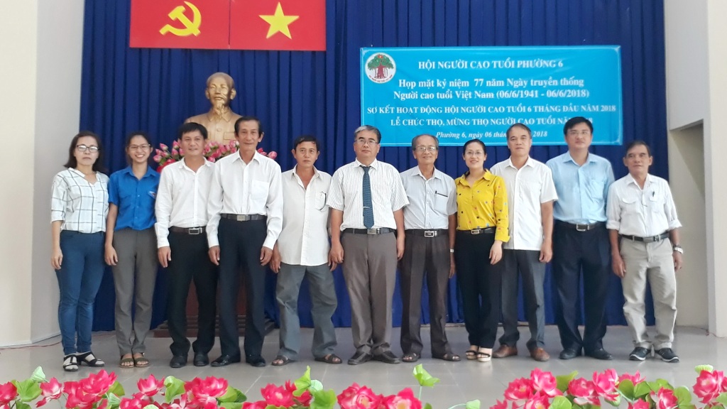 Sáng 06/6, Hội Người cao tuổi Phường 6 đã tổ chức họp mặt kỷ niệm 77 năm Ngày truyền thống Người cao tuổi (06/6/1941 - 06/6/2018), Lễ chúc thọ, mừng thọ Người cao tuổi năm 2018 và sơ kết hoạt động 6 tháng đầu năm 2018. Đến tham dự có: ông Lê Kiến Hiệp, Trưởng ban đại diện Hội Người cao tuổi Quận 8; Ban Thường vụ Đảng ủy phường; Chi ủy, Ban điều hành 6 khu phố; đại diện các đoàn thể phường cùng 130 cụ đại diện cho 240 cụ nhận chúc thọ, mừng thọ.