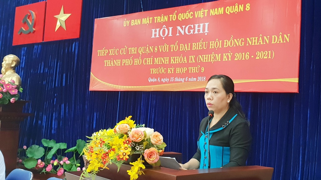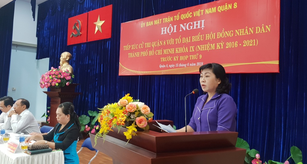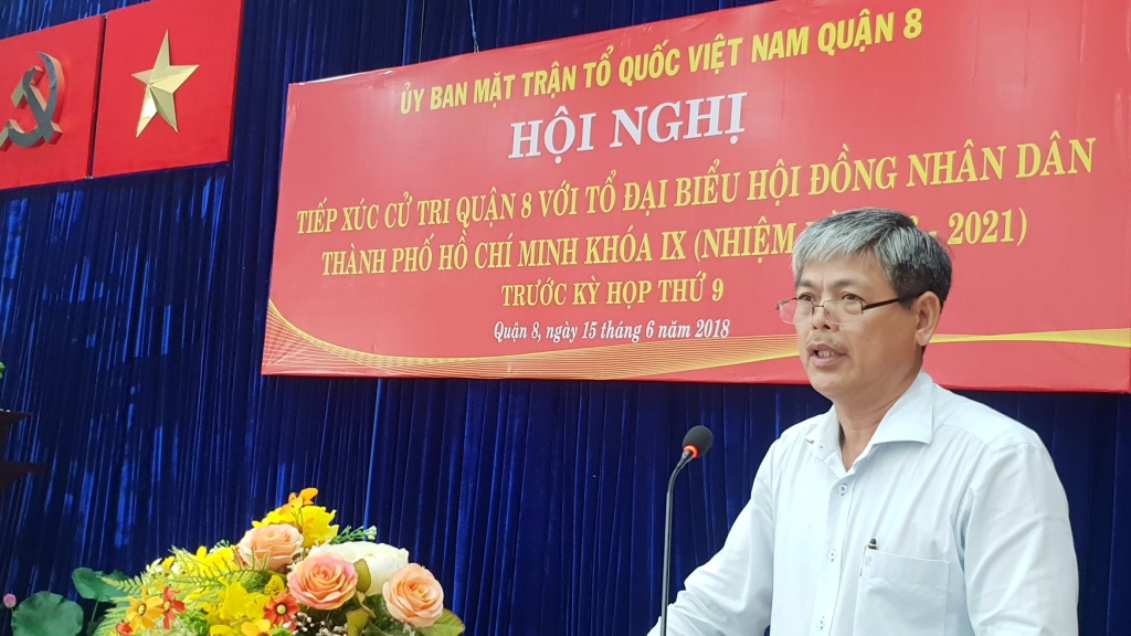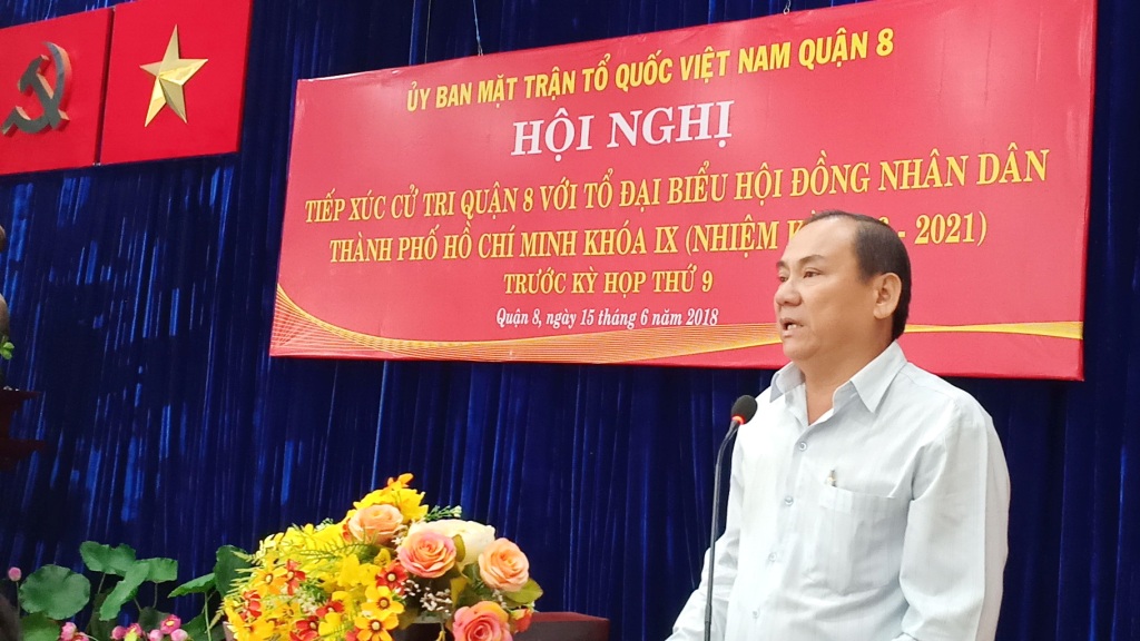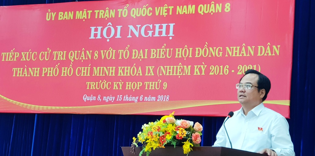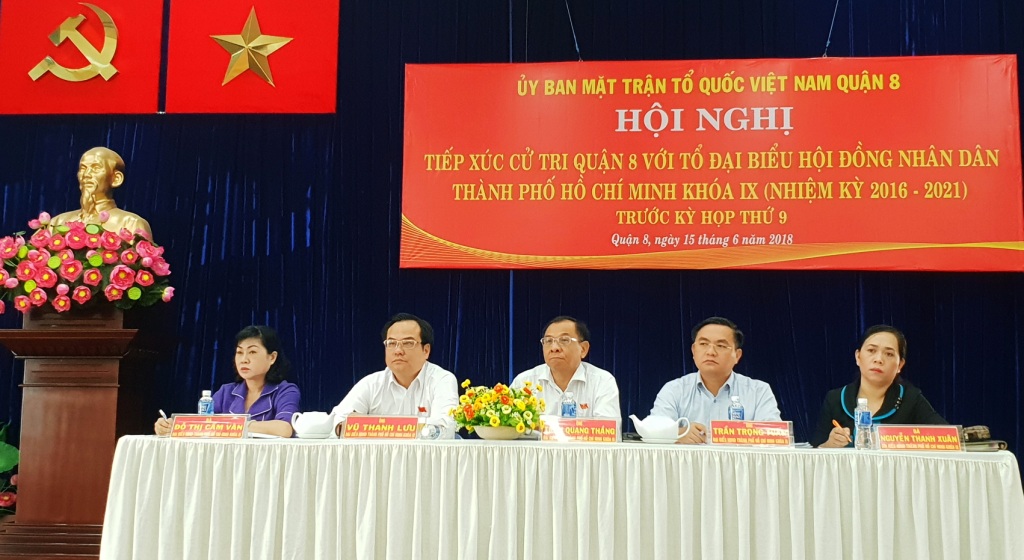 Sáng ngày 15 tháng 6 năm 2018, Tổ Đại biểu Hội đồng Nhân dân Thành phố đơn vị số 8 và số 9, gồm Ông Trần Trọng Tuấn - Ủy viên Ban chấp hành Đảng bộ Thành phố, Giám đốc Sở Xây dựng Thành phố; Ông Nguyễn Quang Thắng - Viện trưởng Viện Kinh tế và quản lý Thành phố; Bà Nguyễn Thanh Xuân - Phó Bí thư Quận ủy Quận 8; Ông Vũ Thanh Lưu - Phó Chủ tịch Ủy ban MTTQ Việt Nam Thành phố Hồ Chí Minh; Bà Đỗ Thị Cẩm Vân - Phó Chủ tịch Hội đồng nhân dân Quận 8, đã có buổi tiếp xúc với cử tri Quận 8 trước kỳ họp lần thứ 9 Hội đồng nhân dân Thành phố khóa IX.