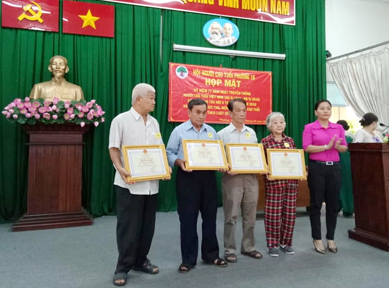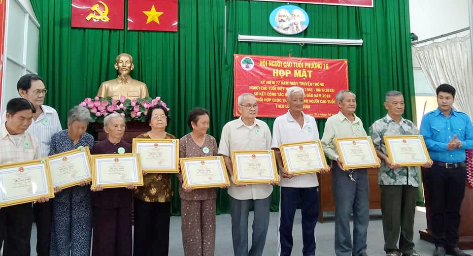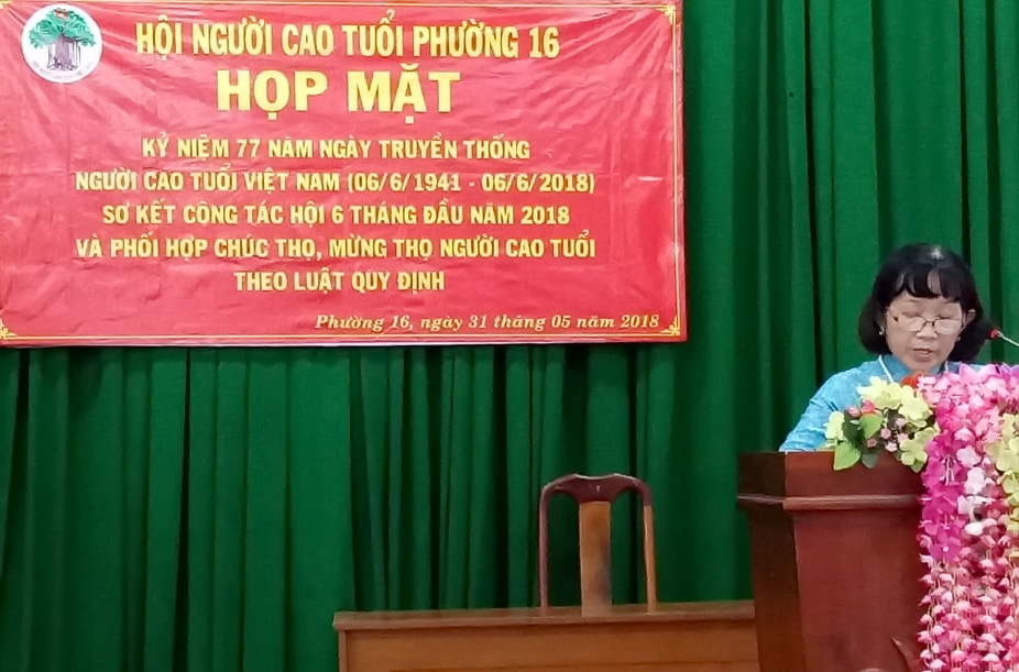 Sáng 31/5, tại hội trường UBND, Hội Người cao tuổi Phường 16 tổ chức họp mặt kỷ niệm 77 năm Ngày truyền thống Người cao tuổi Việt Nam (06/6/1941 – 06/6/2018), sơ kết công tác hội 06 tháng đầu năm và phối hợp chúc thọ, mừng thọ người cao tuổi theo luật quy định. Đến dự buổi lễ có bà Lê Thị Thúy Hằng, Phó Trưởng ban đại diện Hội Người cao tuổi Quận 8; bà Huỳnh Thị Anh Minh, Phó Bí thư Thường trực, Chủ tịch Hội đồng nhân dân; ông Nguyễn Như Hậu, Đảng ủy viên, Phó Chủ tịch Hội đồng nhân dân; ông Trương Hồng Sơn, Đảng ủy viên, Chủ tịch Ủy ban Mặt trận Tổ quốc Việt Nam phường; đại diện các ngành, đoàn thể phường; cấp ủy, khu phố trưởng các khu phố và đông đảo hội viên người cao tuổi trên địa bàn phường.