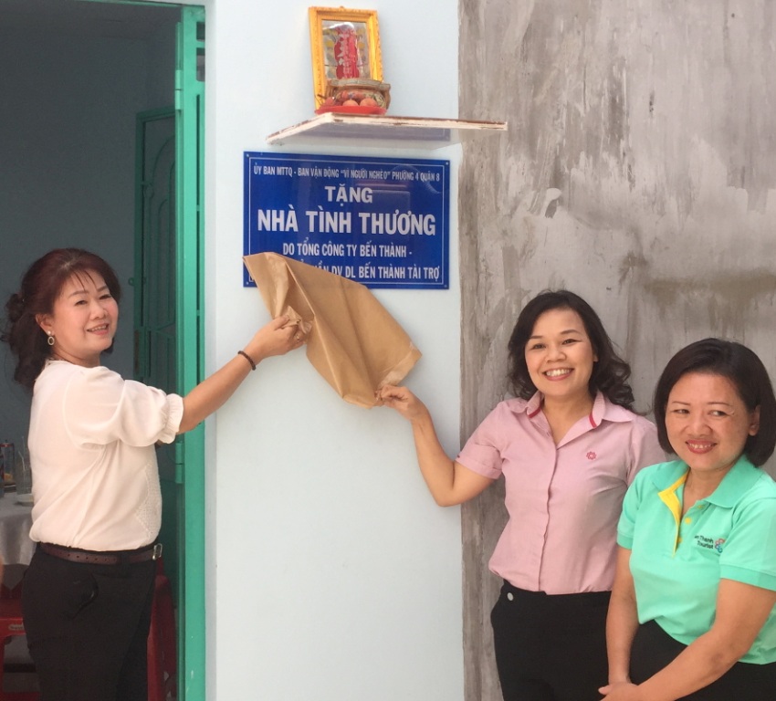 Đại diện đơn vị tài trợ cùng lãnh đạo Phường tháo bảng trao tặng nhà tình thương.