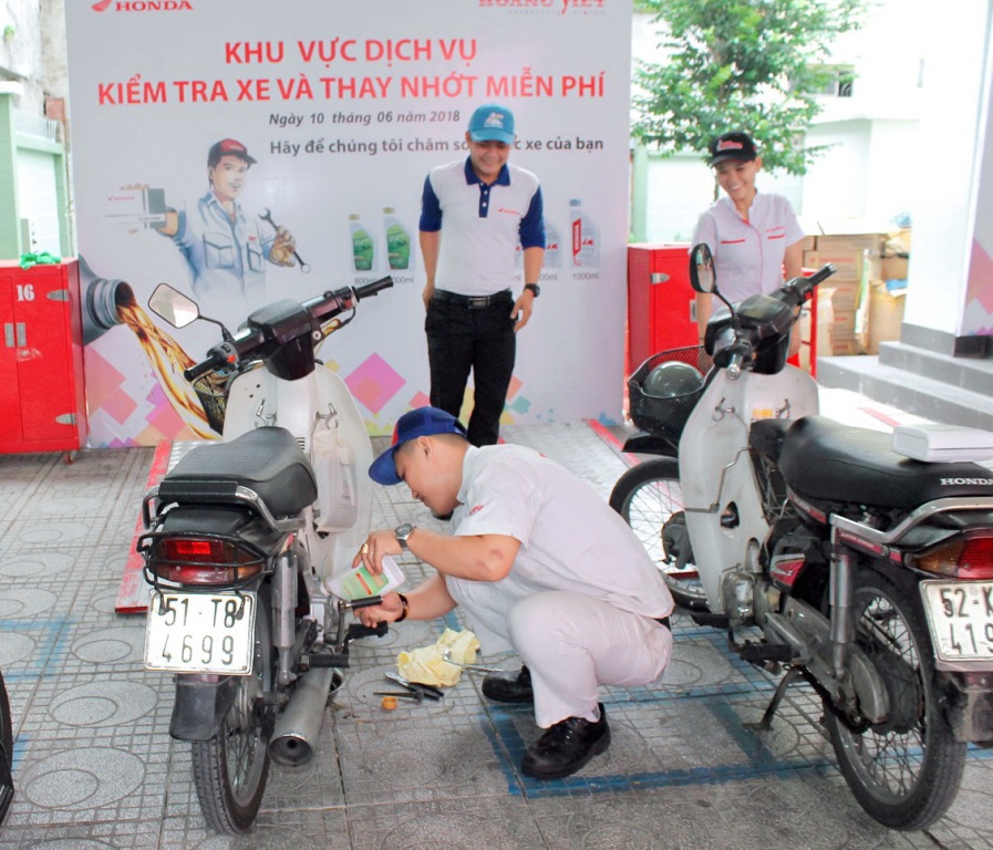 Đại diện HEAD Hoàng Việt 4 thay nhớt miễn phí, kiểm tra xe cho người dân tham dự.