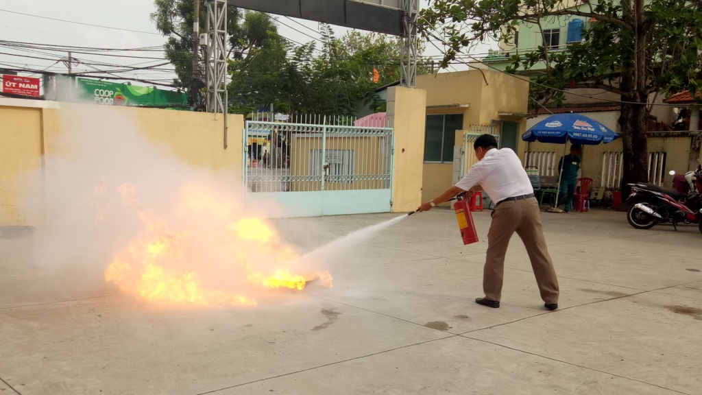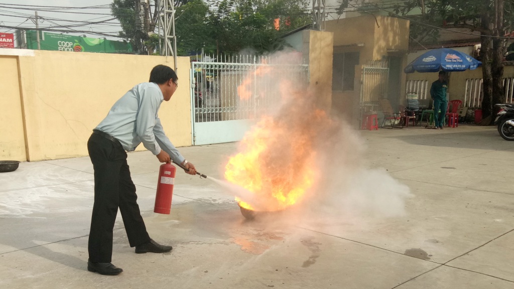 Ông Võ Duy Minh - PCT UBND Phường 7 thực hành sử dụng bình chữa cháy