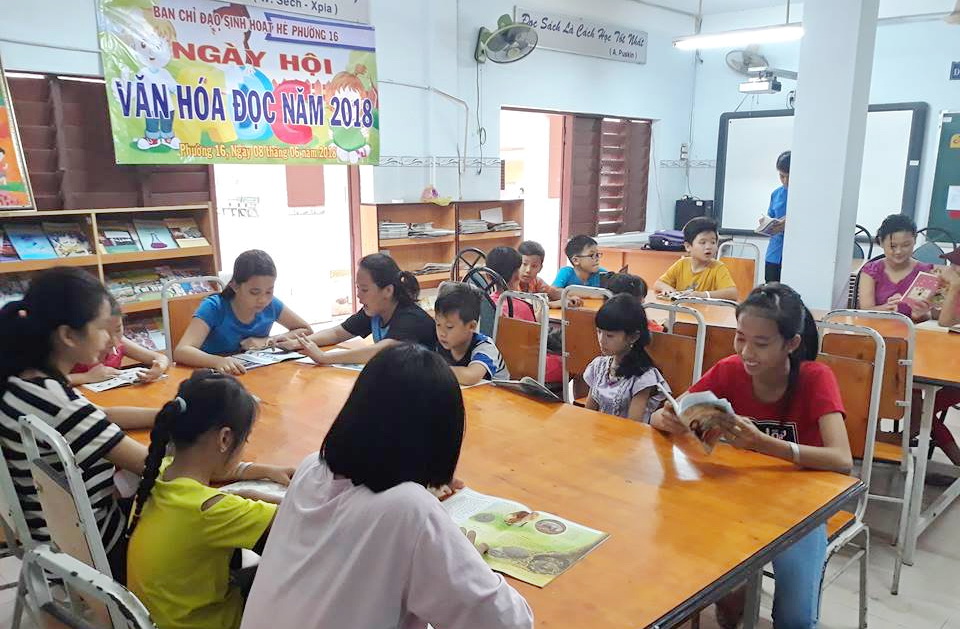 Hiện nay, với sự phát triển bùng nổ của công nghệ thông tin, đặc biệt là các trang mạng xã hội, game online, các trò chơi giải trí…thì việc đọc sách trong giới học sinh hiện nay rất hạn chế. Như chúng ta đã biết, đọc sách đem lại rất nhiều lợi ích, cung cấp nhiều kiến thức về kinh tế, chính trị, văn hóa, xã hội,…ở trong nước và trên thế giới. Tuy nhiên, số lượng học sinh đọc sách hiện nay ngày càng giảm sút hoặc có đọc nhưng không tập trung và đọc không sâu vào từng vấn đề. Kiến thức trên lớp chỉ là nền tảng để học sinh phát triển nhưng chưa đủ để đáp ứng được lượng kiến thức của xã hội. Chính vì vậy chỉ có sách và những trải nghiệm thực tế mới đủ kiến thức phát triển toàn diện. Việc đọc sách cần được diễn ra hàng ngày sẽ giúp học sinh có được lượng kiến thức của nhân loại vô cùng phong phú. Xác định ý nghĩa, lợi ích cũng như thực trạng đọc sách trong học sinh trên địa bàn phường hiện nay cũng như tôn vinh văn hóa đọc, sáng 8/6, tại Trường THCS Bình Đông, Ban Chỉ đạo Sinh hoạt hè Phường 16 tổ chức Ngày hội “Văn hoá đọc” cho đối tượng là các em học sinh. Đến với Ngày hội, các em hiểu rõ hơn ý nghĩa của những ngày tháng lịch sử đấu tranh dựng nước và giữ nước hào hùng của dân tộc thông qua các sách như: Lịch sử Việt Nam bằng tranh, Lịch sử Việt Nam truyền thống và hiện đại, Sử ta chuyện xưa kể lại, Quang Trung đại phá quân Thanh, truyện tranh lịch sử Việt Nam…Ngoài ra, các em còn được tiếp cận với hơn 100 đầu sách hay về giáo dục, khoa học, văn học, nghệ thuật,…rất bổ ích cho các em thiếu nhi trong dịp hè.
