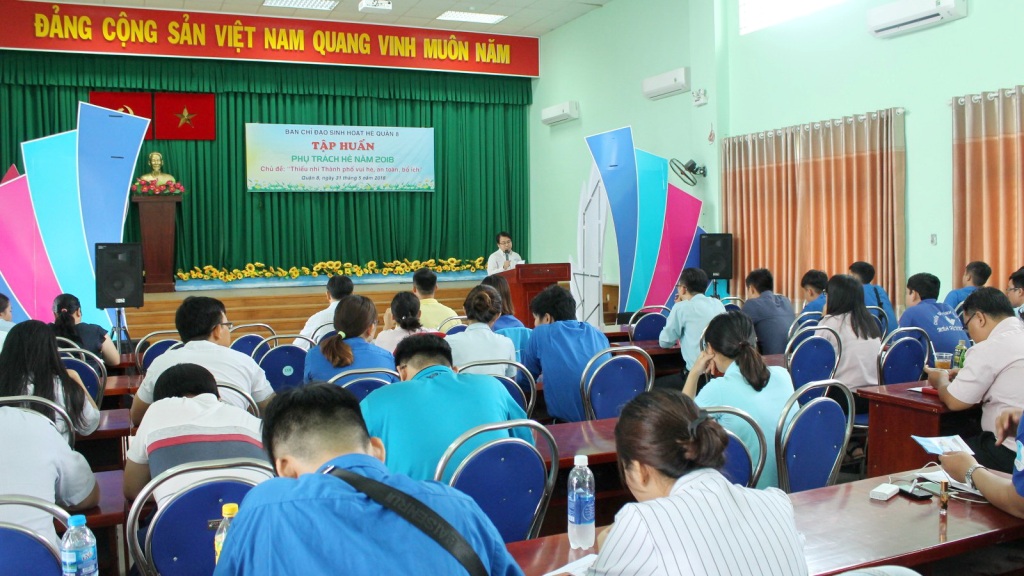 Nhằm đảm bảo cho công tác hè năm 2018 đạt hiệu quả cao theo kế hoạch chỉ đạo của Thường trực Ủy ban nhân dân Quận 8, chiều ngày 31/05/2018, tại Hội trường Quận Đoàn 8, Ban Thường vụ Quận đoàn 8 tổ chức tập huấn phụ trách hè năm 2018 với chủ đề “Thiếu nhi thành phố vui hè an toàn, bổ ích” dành cho hơn 122 bạn là các phụ trách thiếu nhi các phường trong hè 2018. Trong buổi tập huấn, các bạn được tập huấn những nội dung như nội dung cơ bản của kế hoạch hè năm 2018 và một số điểm cần chú ý, hướng dẫn công tác tài chính hè 2018, tập huấn các môn trò chơi vận động hè và một số kế hoạch thi đua trong hè, tập các bài múa - hát sinh họat thiếu nhi, hướng dẫn một số trò chơi sinh hoạt thiếu nhi. Kết thúc lớp tập huấn, các bạn đã được trang bị cơ bản những kiến thức cần có của một phụ trách thiếu nhi, để sẵn sàng nhiệt huyết bước vào một mùa hè sôi động.