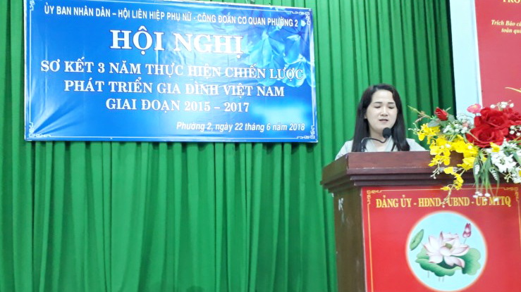 Mở đầu hội nghị, ông Võ La Hiền - Cán bộ Văn hóa - Thể thao và Gia đình phường đọc Báo cáo sơ kết 3 năm thực hiện Chiến lược phát triển gia đình Việt Nam, giai đoạn 2015 - 2017 trên địa bàn Phường 2. Kế đến, bà Đoàn Thị Thanh Tuyền - Đảng ủy viên, Phó Chủ tịch UBND phường phát biểu chỉ đạo trong hội nghị.