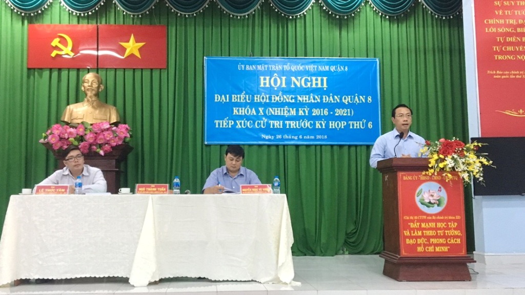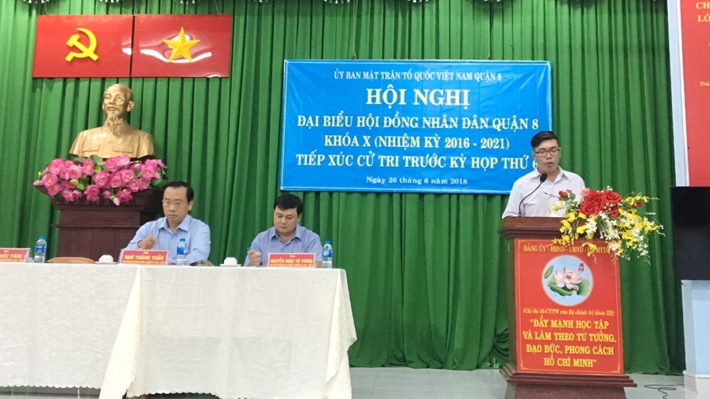 Chiều ngày 26 tháng 6 năm 2018, tại Hội trường Ủy ban nhân dân phường 2, Tổ đại biểu Hội đồng nhân dân Quận 8 (đơn vị số 2) tiếp xúc cử tri phường 2 trước kỳ họp Hội đồng nhân dân Quận 8 lần thứ sáu. Đến dự hội nghị có Ông Ngô Thành Tuấn - Bí thư Quận ủy, Chủ tịch Hội đồng nhân Quận 8; Ông Nguyễn Ngọc Vũ Vương - Phó Trưởng Công an Quận 8, Tổ trưởng Tổ đại biểu HĐND Quận 8 (đơn vị số 2); Ông Lê Thức Tâm - Bí thư Đoàn TNCS Hồ Chí Minh Phường 2, đại biểu HĐND Quận 8 (đơn vị số 2); Ông Lê Văn Hậu - Quận ủy viên, Bí thư Đảng ủy, Chủ tịch Hội đồng nhân dân Phường 2; Ông Nguyễn Văn Thanh - Phó Bí thư Thường trực Đảng ủy Phường 2; Ông Hồ Thanh Bình - Phó Bí thư, Chủ tịch Ủy ban nhân dân Phường 2; ông Lê Thanh Tú - Ủy viên Thường vụ Đảng ủy, Chủ tịch Ủy ban MTTQ Việt Nam Phường 2 - Chủ trì hội nghị; các vị đại biểu Hội đồng nhân dân Phường 2 và 100 cử tri khu phố.