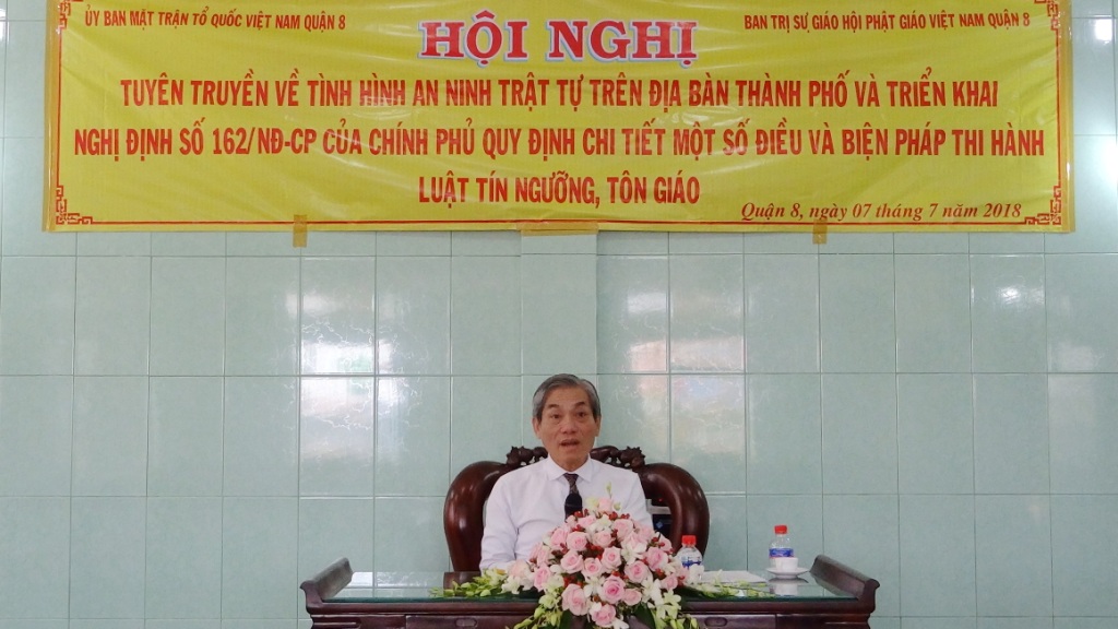 Chiều ngày 07 tháng 7 năm 2018, tại Chùa Pháp Quang, Phường 5 - Quận 8, Ủy ban Mặt trận Tổ quốc Việt Nam Quận 8 phối hợp Ban Trị sự Giáo hội Phật giáo Việt Nam Quận 8 tổ chức Hội nghị tuyên truyền về tình hình an ninh trật tự trên địa bàn thành phố và triển khai Nghị định số 162/NĐ-CP của Chính phủ quy định chi tiết một số điều và biện pháp thi hành Luật Tín ngưỡng, tôn giáo nhân mùa an cư kiết hạ năm 2018.
