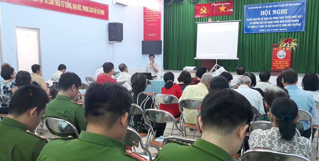 Chiều ngày 13 tháng 7 năm 2018, tại Hội trường Ủy ban nhân dân Phường 2, Ủy ban Mặt trận Tổ quốc Việt Nam Phường 2 phối hợp với Ủy ban nhân dân Phường 2 tổ chức Hội nghị tuyên truyền về dịch vụ công trực tuyến mức độ 3 và hướng dẫn sử dụng phần mềm Dash board về quản lý trật tự đô thị và vệ sinh môi trường. Đến dự Hội nghị có Ông Lê Thanh Tú - Chủ tịch Ủy ban Mặt trận Tổ quốc Việt Nam Phường 2, ông Nguyễn Mậu Bằng - Phó Chủ tịch Ủy ban nhân dân Phường 2, bà Phan Diệu Quỳnh Oanh - Phó Chủ tịch Hội đồng Nhân dân Phường 2. Báo cáo viên hội nghị: Ông Phạm Ngọc Hiệp - Tổ phó Tổ Công nghệ thông tin Văn phòng Hội đồng nhân dân và Ủy ban nhân dân Quận 8 và hơn 90 đại biểu là thành viên Ban Công tác Mặt trận khu phố, Tổ trưởng Tổ dân phố, cảnh sát khu vực tham dự.