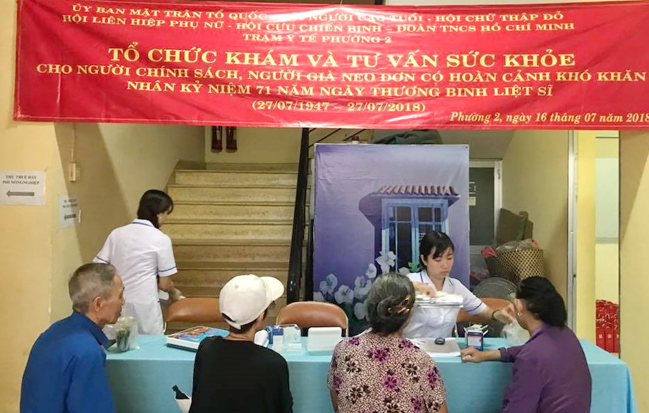 Sáng ngày 16/7/2018, tại Hội trường Ủy ban nhân dân Phường 2, Ủy ban Mặt trận Tổ quốc Việt Nam Phường 2 phối hợp với Hội Người Cao tuổi, Hội Chữ Thập đỏ, Hội Cựu Chiến binh, Hội Liên hiệp Phụ nữ, Đoàn Thanh niên và Trạm Y tế Phường 2 tổ chức khám và tư vấn sức khỏe cho người thuộc diện gia đình chính sách, người nghèo, người già neo đơn có hoàn cảnh khó khăn.