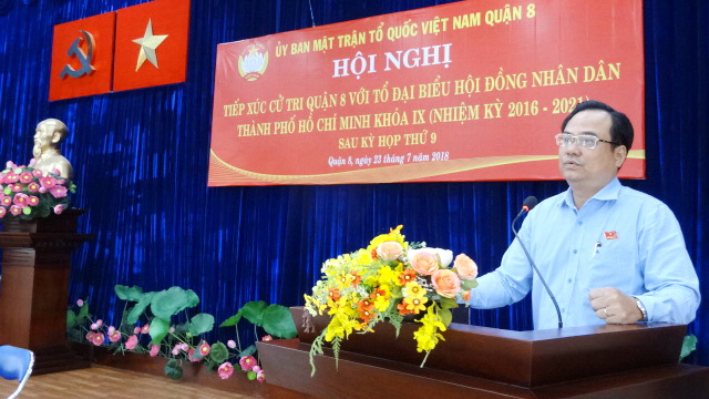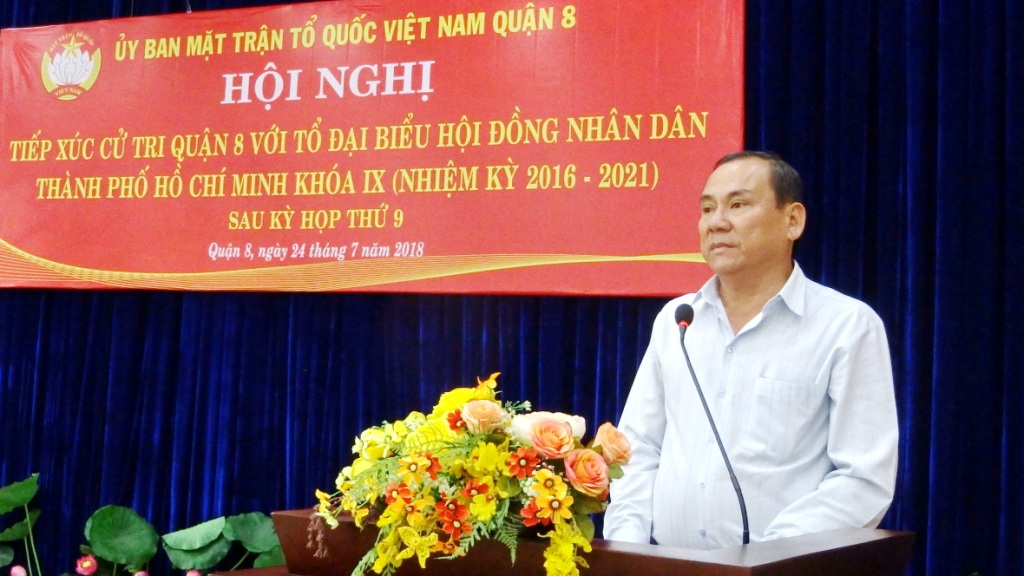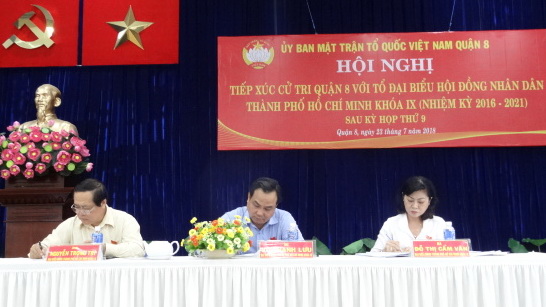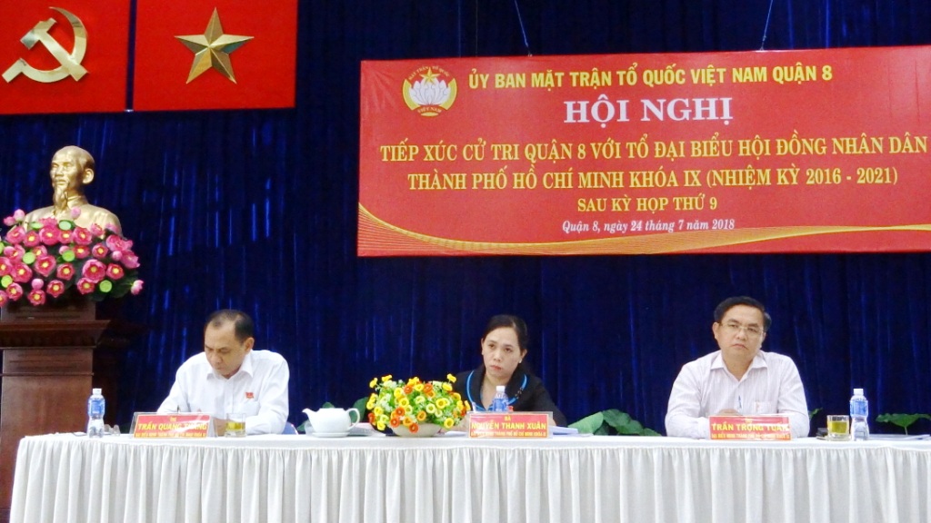 Chiều ngày 23 và 24 tháng 7 năm 2018, Tổ Đại biểu Hội đồng Nhân dân Thành phố đơn vị số 8 và số 9, gồm Ông Trần Trọng Tuấn - Ủy viên Ban chấp hành Đảng bộ Thành phố, Giám đốc Sở Xây dựng Thành phố; Ông Trần Quang Thắng - Viện trưởng Viện Kinh tế và quản lý Thành phố; Bà Nguyễn Thanh Xuân - Phó Bí thư Quận ủy Quận 8; Ông Vũ Thanh Lưu - Phó Chủ tịch Ủy ban MTTQ Việt Nam Thành phố Hồ Chí Minh; Ông Nguyễn Trọng Trí - Phó Giám đốc Đài Tiếng nói nhân dân Thành phố Hồ Chí Minh; Bà Đỗ Thị Cẩm Vân - Phó Chủ tịch Hội đồng nhân dân Quận 8, đã có buổi tiếp xúc với cử tri Quận 8 sau kỳ họp thứ 9 Hội đồng nhân dân Thành phố khóa IX.
