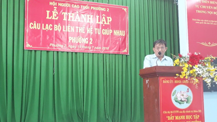 Câu lạc bộ “Liên thế hệ tự giúp nhau” là mô hình do Trung ương Hội Người cao tuổi Việt Nam phát động, nhằm tạo cơ hội cho người cao tuổi cải thiện đời sống vật chất, tinh thần, tiếp cận kiến thức về chăm sóc sức khỏe và tăng cường vai trò, sự đóng góp của người cao tuổi đối với xã hội. Với ý nghĩa đó, 08 giờ sáng ngày 19 tháng 7 năm 2018 tại hội trường Ủy ban nhân dân Phường 2, Hội Người Cao tuổi Phường 2 tổ chức Lễ ra mắt Câu lạc bộ “Liên thế hệ tự giúp nhau”. Tham dự buổi lễ có ông Lê Kiến Hiệp - Trưởng Ban đại diện Hội Người Cao tuổi (NCT) Quận 8; ông Hồ Thanh Bình - Phó Bí thư Đảng ủy phường, Chủ tịch UBND phường; ông Lê Thanh Tú - Ủy viên Thường vụ Đảng ủy, Chủ tịch Ủy ban Mặt trận Tổ quốc Việt Nam phường; bà Phan Diệu Quỳnh Oanh - ĐUV, Phó Chủ tịch HĐND phường; bà Đoàn Thị Thanh Tuyền - ĐUV, Phó Chủ tịch UBND phường; đại diện các ban ngành, đoàn thể phường; đại diện cấp ủy chi bộ và Trưởng/Phó 07 khu phố cùng với 65 thành viên CLB “Liên thế hệ tự giúp nhau”.