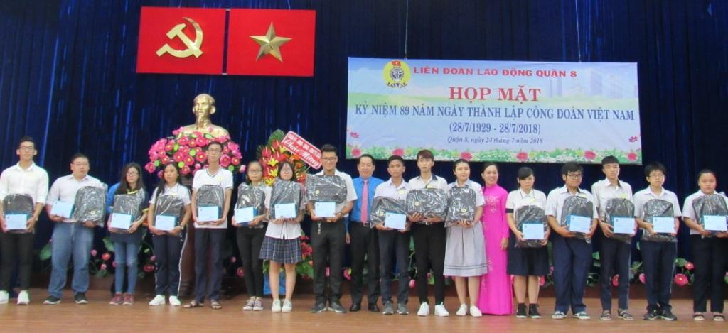 Dịp này, Liên đoàn Lao động quận đã trao tặng Kỷ niệm chương “Vì sự nghiệp xây dựng tổ chức Công đoàn” cho 06 cá nhân tiêu biểu; 01 “Mái ấm công đoàn”, 01 Sổ tiết kiệm trị giá 5 triệu đồng, 03 Góc sinh hoạt cho công nhân và học bổng Nguyễn Đức Cảnh cho 52 học sinh nghèo, có thành tích xuất sắc trong học tập với tổng trị giá hơn 40 triệu đồng.