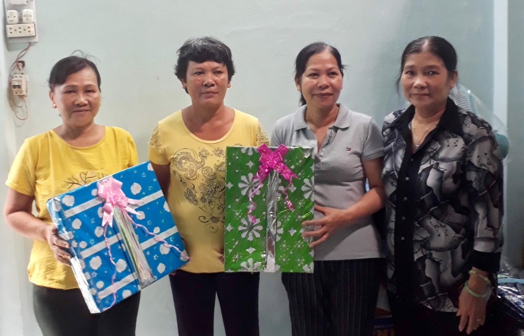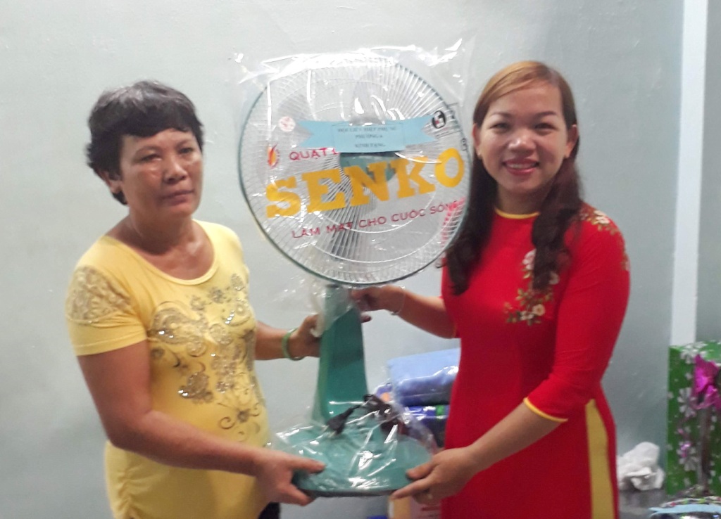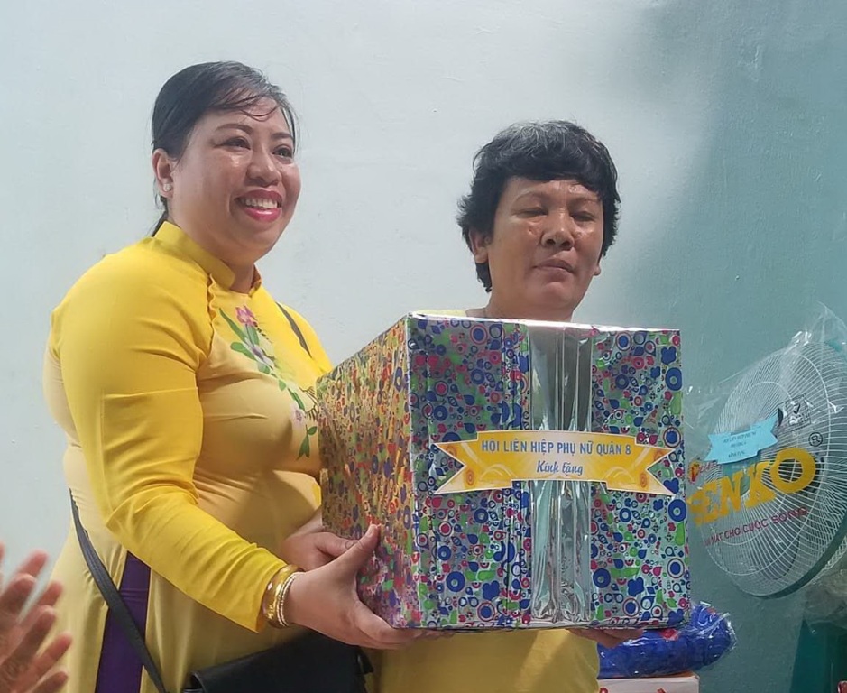 Bà Trần Thị Thanh Xuân, Ủy viên Ban Thường vụ Hội Liên hiệp phụ nữ Quận 8 tặng quà cho gia đình bà Tỷ.
