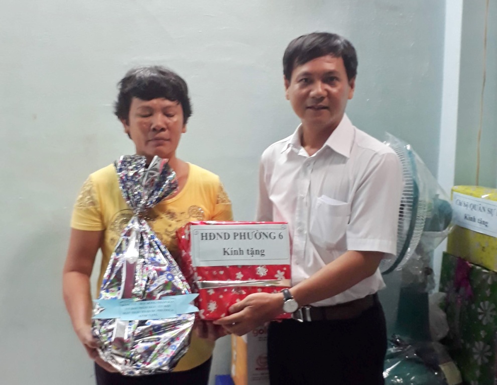 Ông Nguyễn Quang Huy, Quận ủy viên, Bí thư Đảng ủy, Chủ tịch Hội đồng nhân dân Phường 6 tặng quà cho gia đình bà Tỷ.