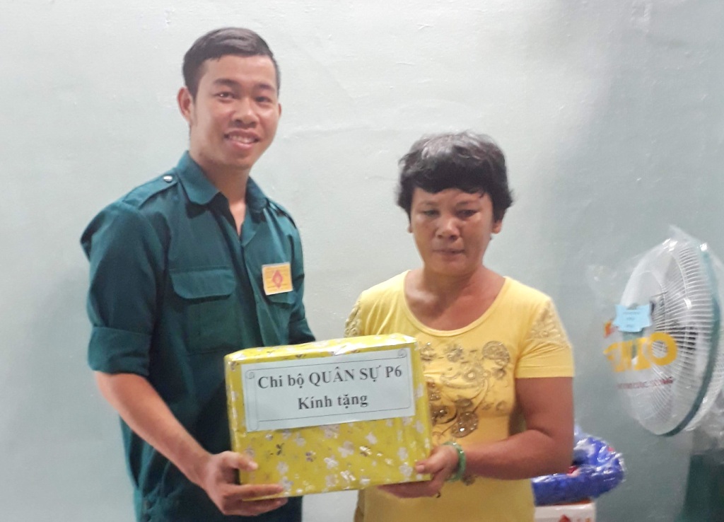 Đại diện Chi bộ Quân sự tặng quà cho gia đình bà Tỷ.