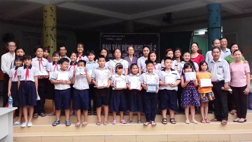Các em học sinh giỏi nhận dụng cụ học tập do khu phố trao tặng