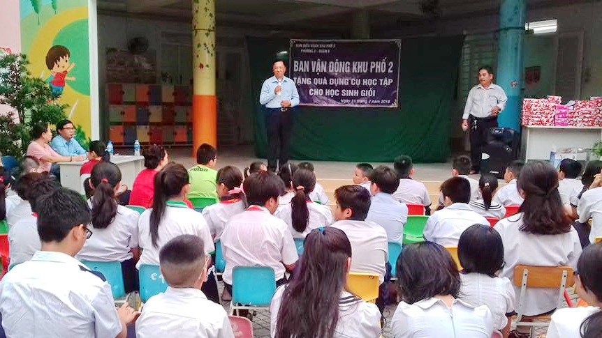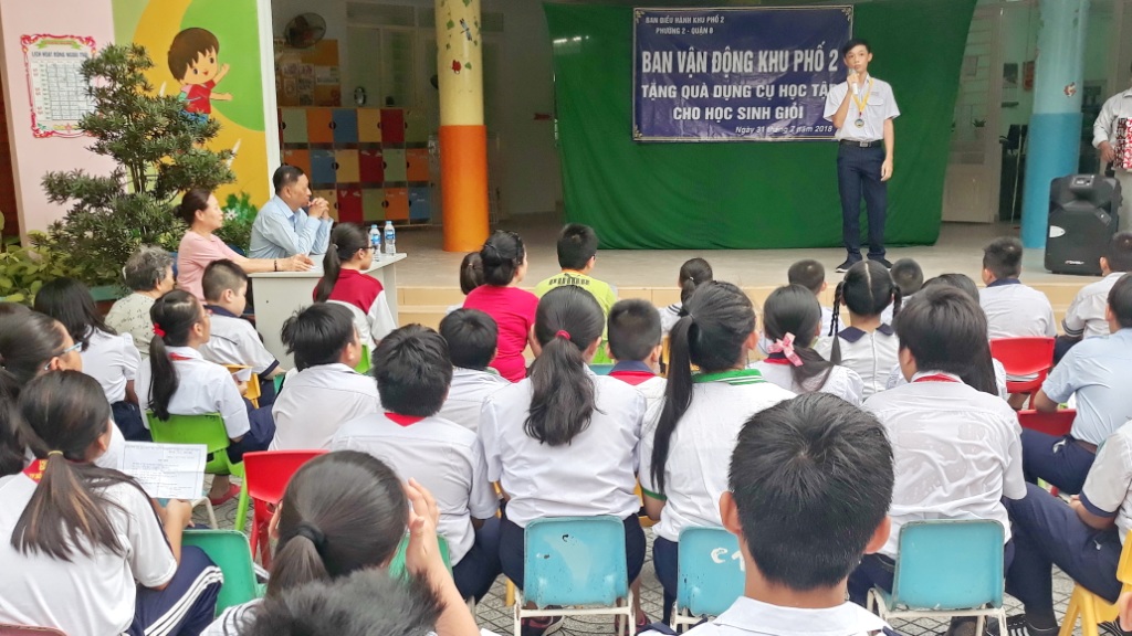 Phát biểu tại buổi lễ trao tặng dụng cụ học tập, Ông Nguyễn Đình Thái Châu - Trưởng Ban công tác Mặt trận Khu phố 2 nhấn mạnh việc chăm lo dụng cụ học tập cho các em học sinh giỏi nhằm tuyên truyền sâu rộng chủ trương của Đảng và Nhà nước là xây dựng nền giáo dục quốc gia là quốc sách hàng đầu, chăm lo giáo dục cho thế hệ trẻ là trách nhiệm của toàn xã hội trong việc xây dựng một xã hội học tập, góp phần ngăn chặn nguy cơ thất học, bỏ học, chăm lo hỗ trợ kịp thời giúp cho các em có thêm điều kiện học tập, nâng cao trình độ, trở thành người có ích cho xã hội.