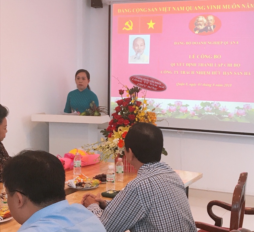 Nhằm tiếp tục đẩy mạnh việc thực hiện Chỉ thị số 07-CT/TW của Trung ương Đảng và Chỉ thị số 10-CT/TU của Thành ủy về tăng cường công tác xây dựng tổ chức Đảng, đoàn thể chính trị - xã hội trong các doanh nghiệp ngoài khu vực nhà nước, đơn vị sự nghiệp ngoài công lập. Chiều ngày 03/8/2018 Đảng ủy Doanh nghiệp Quận 8 đã tổ chức Lễ trao Quyết định thành lập Chi bộ Công ty TNHH San Hà trực thuộc Đảng bộ Doanh nghiệp Quận 8. Đến dự và trao quyết định thành lập chi bộ có đồng chí Nguyễn Thanh Xuân, Phó Bí thư Quận ủy, đồng chí Hà Văn Lợi, UVBTV, Trưởng Ban Tổ chức Quận ủy; bà Phạm Thị Ngọc Hà, Tổng Giám đốc công ty và Ban giám đốc Công ty TNHH San Hà.