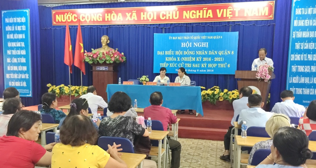 Tại buổi tiếp xúc các cử tri đã nghe ông Huỳnh Anh Kiệt – Phó trưởng Ban kinh tế xã hội HĐND Quận 8 báo cáo kết quả, chương trình kỳ họp thứ 6 HĐND Quận 8; và nghe bà Vũ Yến Oanh – Đại biểu HĐND Quận 8, Phó bí thư – Chủ tịch UBND Phường trả lời các ý kiến, kiến nghị của cử tri trong buổi tiếp xúc.