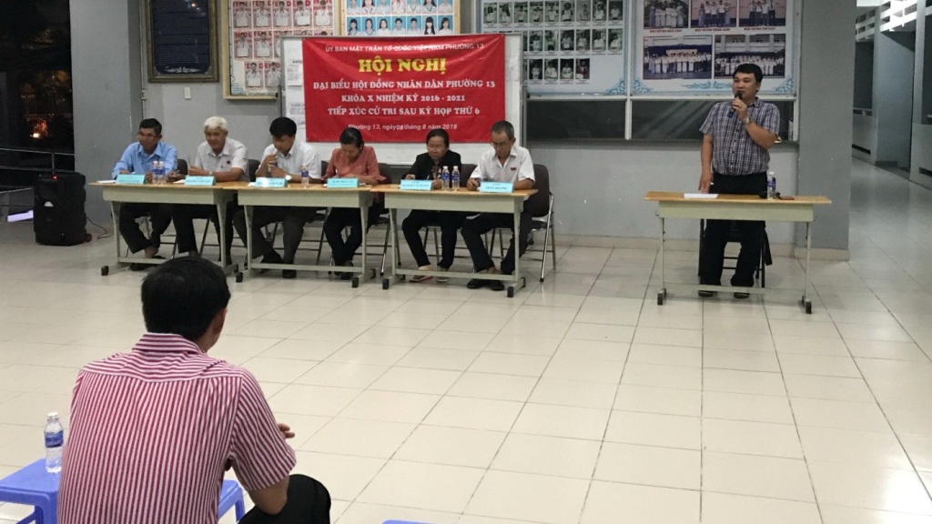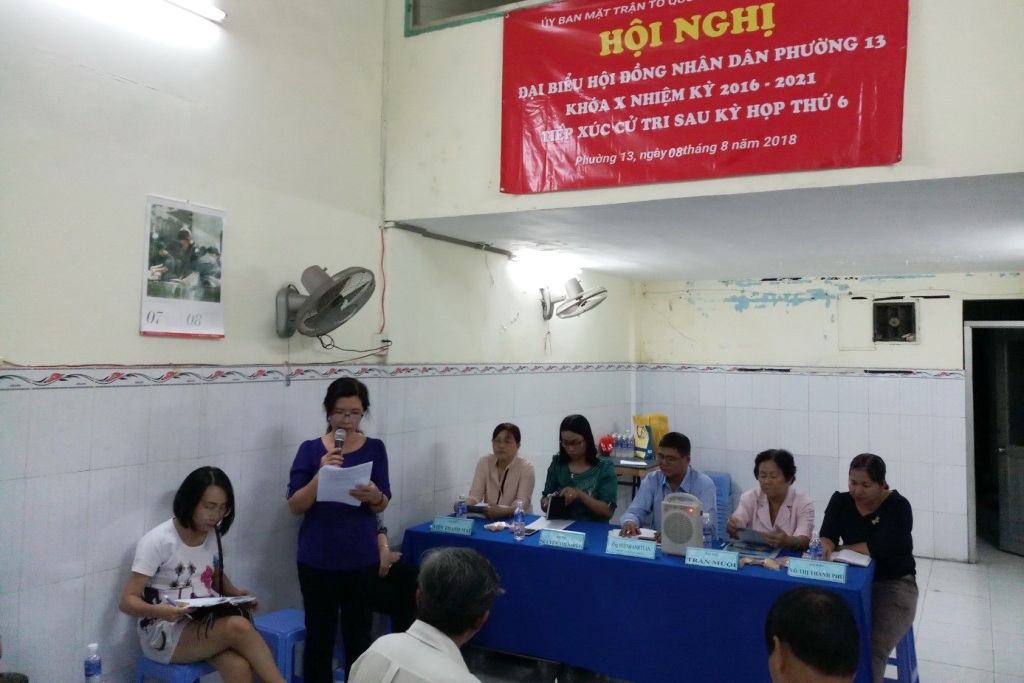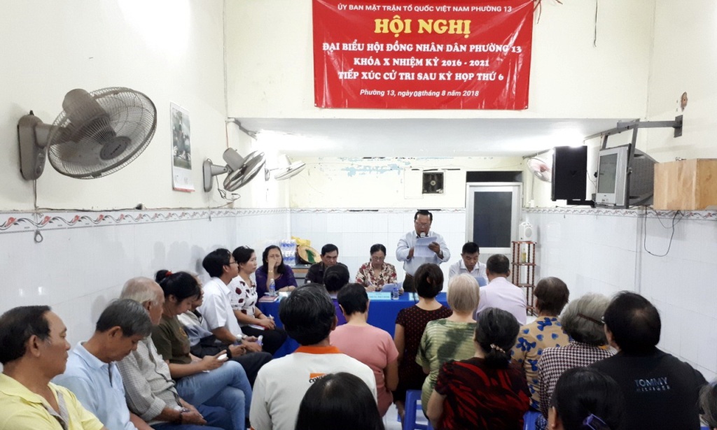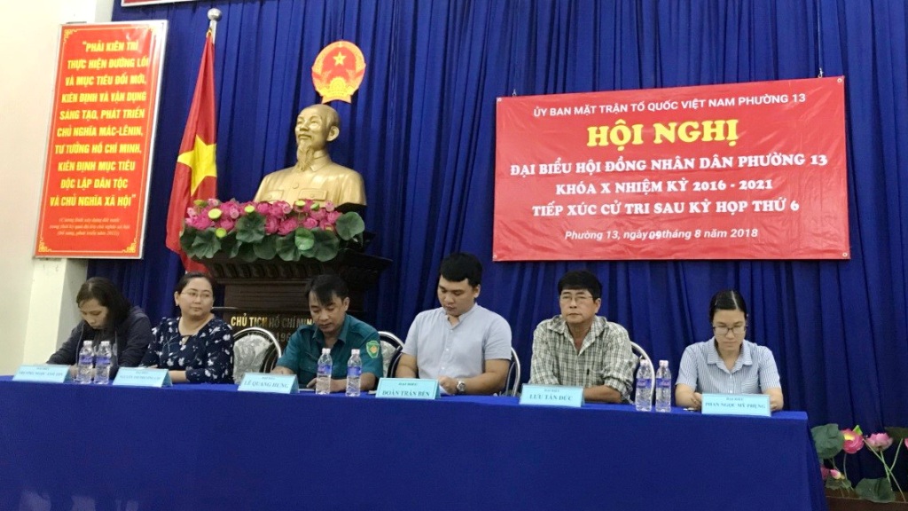 Ngày 08, 09/8/2018, Ban Thường trực Ủy ban Mặt trận Tổ quốc Phường 13 đã chủ trì tổ chức các Hội nghị đại biểu Hội đồng nhân dân Phường 13 Khóa X nhiệm kỳ 2016-2021 tiếp xúc cử tri với sau kỳ họp thứ 6 tại 4 Khu phố.