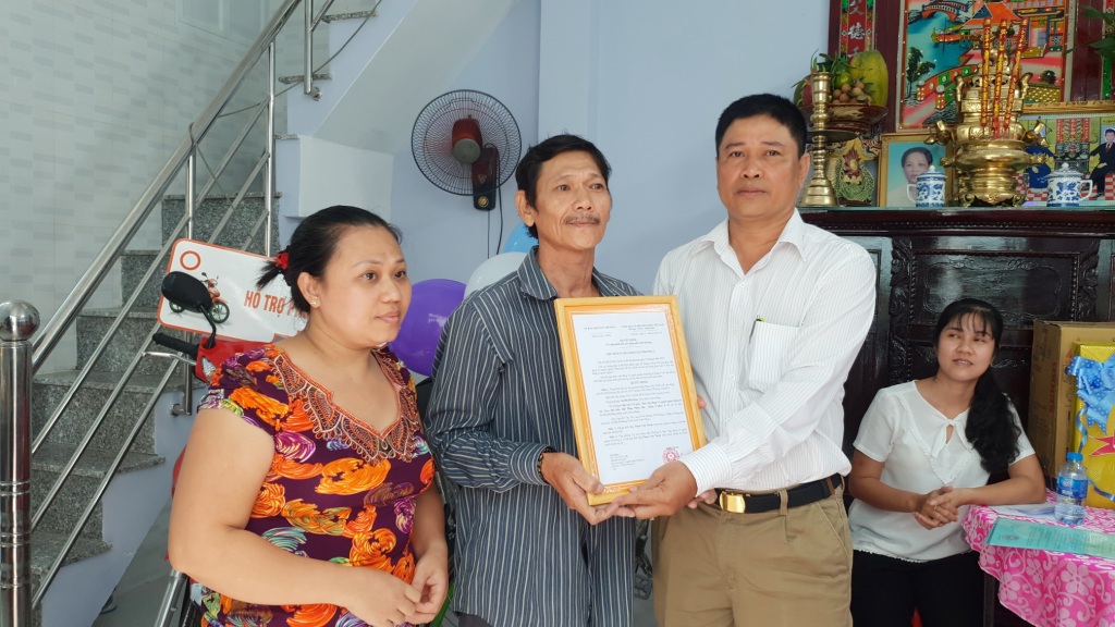 Ông Cao Văn Đổi - Phó Bí thư Đảng ủy, Chủ tịch Ủy ban nhân dân Phường 4 trao Quyết định tặng kinh phí xây dựng Nhà tình thương cho gia đình Ông Phạm Văn Thơm