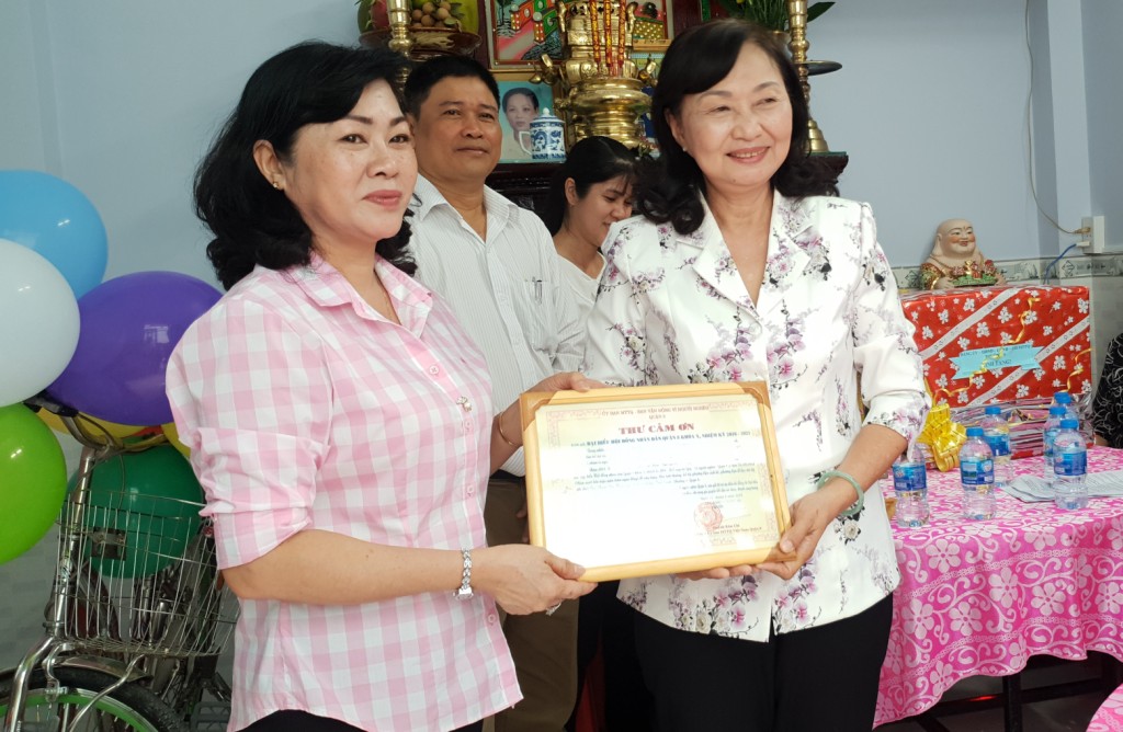 Bà Huỳnh Kim Chi - Ủy viên Ban Thường vụ Quận ủy, Chủ tịch Ủy ban Mặt trận Tổ quốc Việt Nam Quận 8 trao thư cảm ơn đến Thường trực Hội đồng nhân dân Quận 8 khóa X, nhiệm kỳ 2016-- 2021.