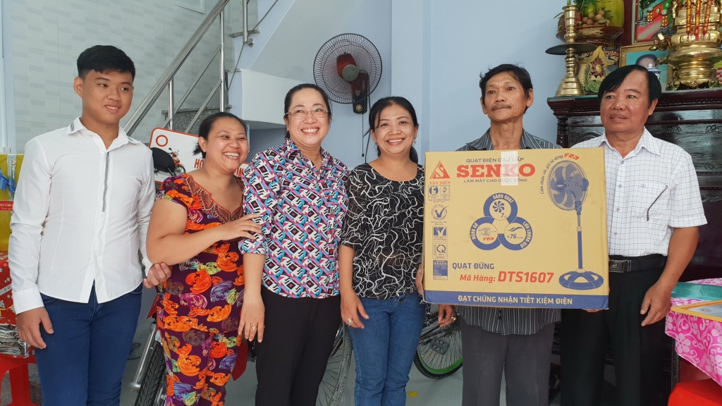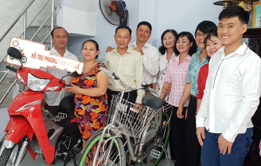 Các đồng chí lãnh đạo quận, phường trao tặng phương tiện sinh kế và phương tiện đi học cho gia đình Ông Phạm Văn Thơm.