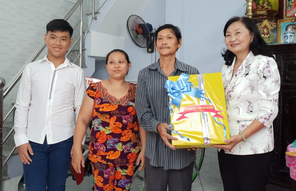 Bà Huỳnh Kim Chi - Ủy viên Ban Thường vụ Quận ủy, Chủ tịch Ủy ban Mặt trận Tổ quốc Việt Nam Quận 8 trao tặng quà cho gia đình Ông Phạm Văn Thơm.