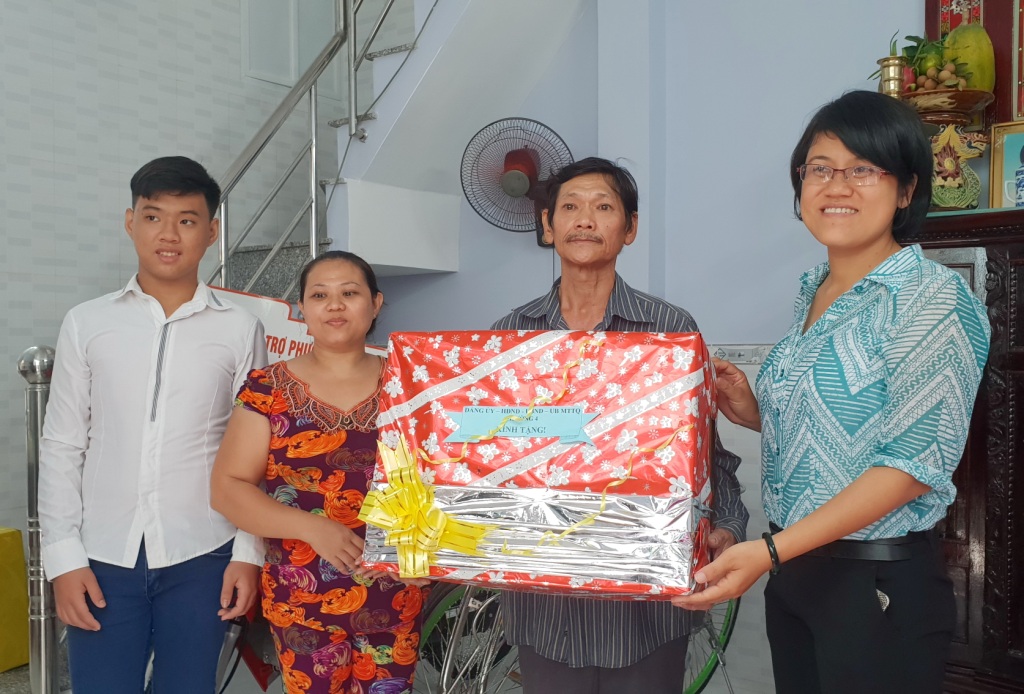 Bà Dương Thu Thủy - Bí thư Đảng ủy Phường 4 trao tặng quà cho gia đình Ông Phạm Văn Thơm.