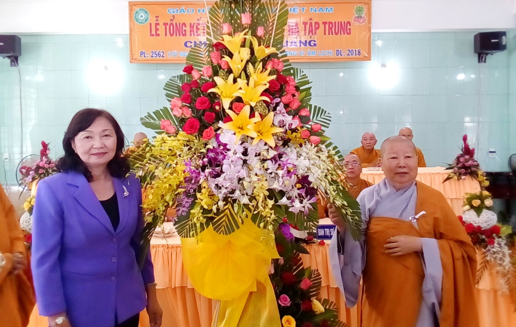Bà Huỳnh Kim Chi - Ủy viên Ban Thường vụ Quận ủy, Chủ tịch Ủy ban Mặt trận Tổ quốc Việt Nam Quận 8 tặng hoa chúc mừng nhân Lễ Tạ pháp - Bế giảng khóa an cư kiết hạ (Phật lịch 2562 - Dương lịch 2018).