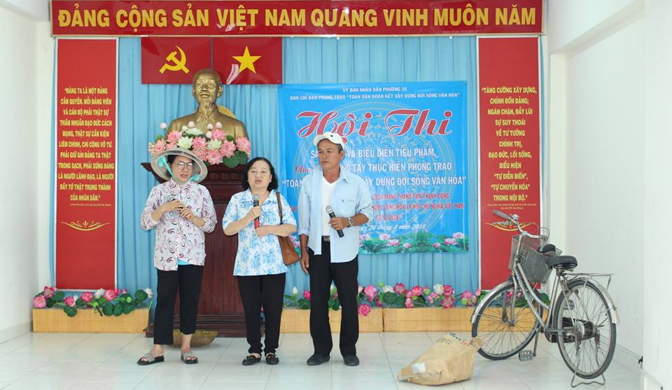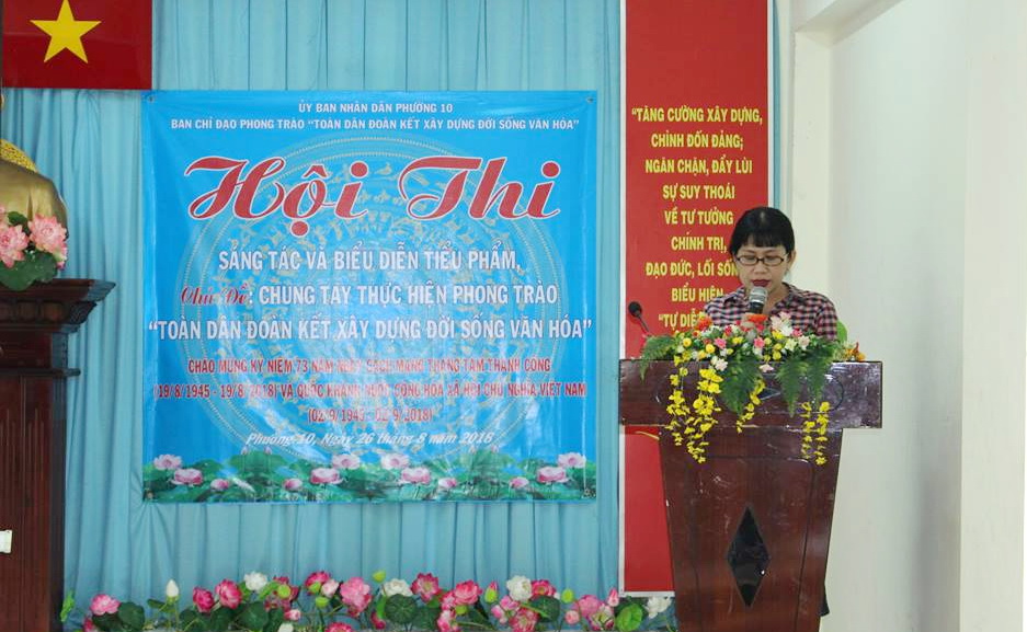 Nhằm nâng cao hiệu quả hoạt động Phong trào “Toàn dân đoàn kết xây dựng đời sống văn hóa” và chào mừng kỷ niệm 73 năm Ngày Cách mạng tháng tám thành công (19/8/1945 – 19/8/2018) và Quốc khánh Nước Cộng hòa xã hội chủ nghĩa Việt Nam (2/9/1945 – 2/9/2018), sáng ngày 26 tháng 8 năm 2018, Ban Chỉ đạo phong trào “Toàn dân đoàn kết xây dựng đời sống văn hóa” Phường 10 tổ chức Hội thi Sáng tác và biểu diễn tiểu phẩm, chủ đề: Chung tay thực hiện Phong trào “Toàn dân đoàn kết xây dựng đời sống văn hóa”