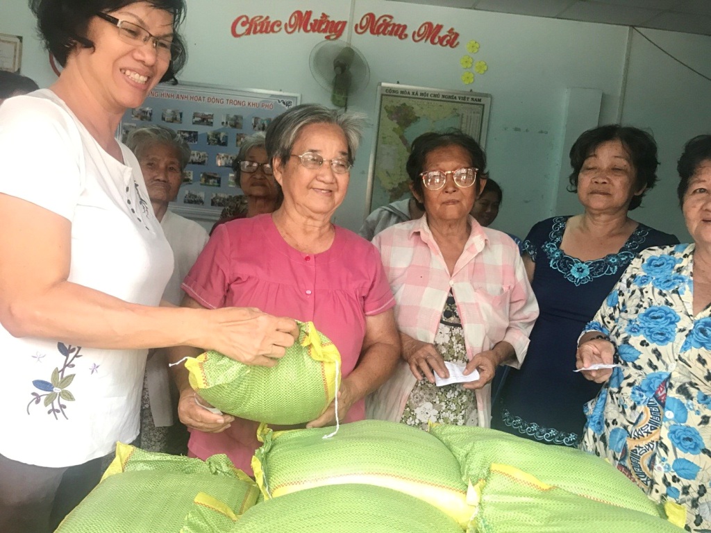 Bà Phùng Thị Liễu – Bí thư chi bộ - Trưởng ban công tác Mặt trận Khu phố 4 trao gạo cho dân nghèo khu phố.