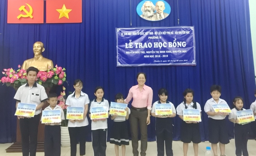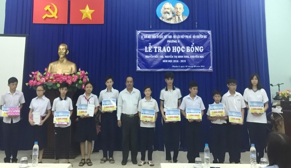 Ủy ban MTTQVN Phường 9 trao tặng 29 suất học bổng Nguyễn Hữu Thọ với tổng số tiền 52.000.000 đồng (trong đó, học sinh cấp 1 có 12em x 1.500.000 đ/suất = 18.000.000 đ; học sinh cấp 2,3 có 17em x 2.000.000 đ/suất=34.000.000đ). Hội LHPN và Hội khuyến học Phường 9 cũng trao tặng 32 suất học bổng với tổng số tiền 33.000.000 đồng; Ban tổ chức còn trao tặng mỗi em nhận học bổng 10 quyển tập. Tổng số học bổng phát ra là 61 suất và 610 quyển tập với tổng số tiền là 88.050.000 đồng.