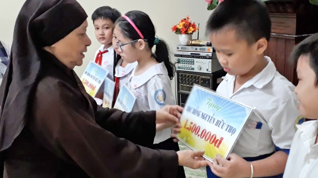 Địa diện nhà tài trợ và lãnh đạo quận, phường trao học bổng và chụp hình cùng các em học sinh.
