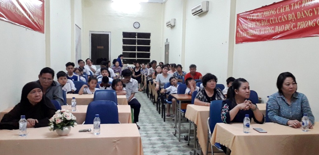 Tại buổi lễ, đại biểu được nghe báo cáo công tác thực hiện cuộc vận động vì người nghèo và công tác chăm lo học bổng Nguyễn Hữu Thọ năm học 2018.