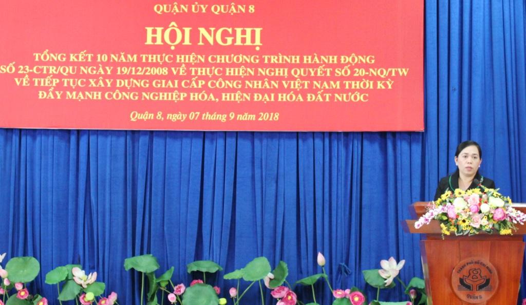 Sáng 7/9, Quận ủy Quận 8 đã tổ chức Hội nghị tổng kết 10 năm thực hiện Nghị quyết số 20-NQ/TW của Ban Chấp hành Trung ương Đảng khóa X và Chương trình hành động số 38-CTrHĐ/TU của Ban Thường vụ Thành ủy về tiếp tục xây dựng giai cấp công nhân Việt Nam thời kỳ đẩy mạnh công nghiệp hóa, hiện đại hóa đất nước. Đến dự có các đồng chí: Tô Thị Thủy, Phó Trưởng Phòng Dân vận các cơ quan Nhà nước, Ban Dân vận Thành ủy; đ/c Nguyễn Thanh Xuân, Phó Bí thư Quận ủy.