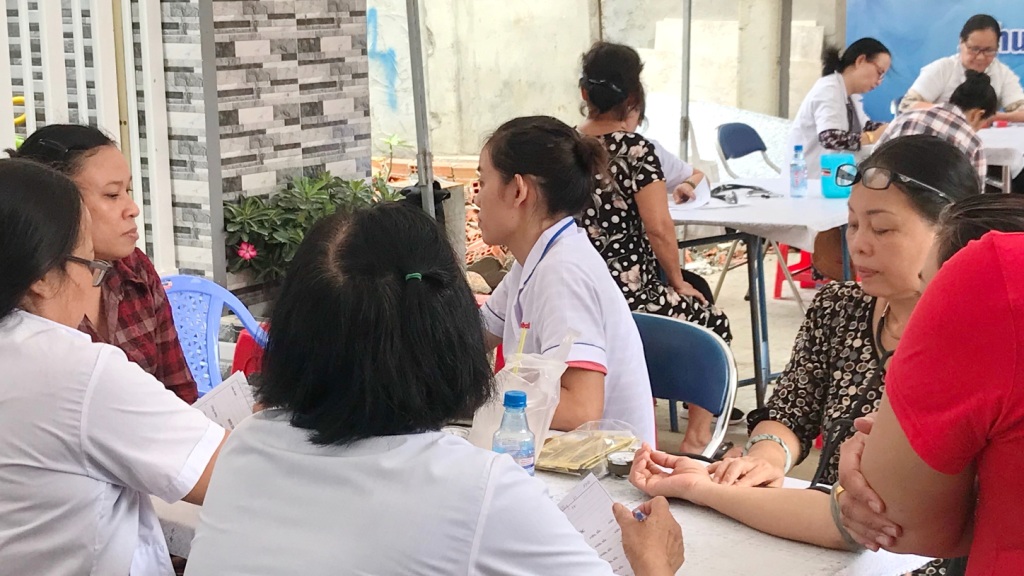 Các cụ được đo huyết áp, và thử đường trước khi Bác sĩ khám.