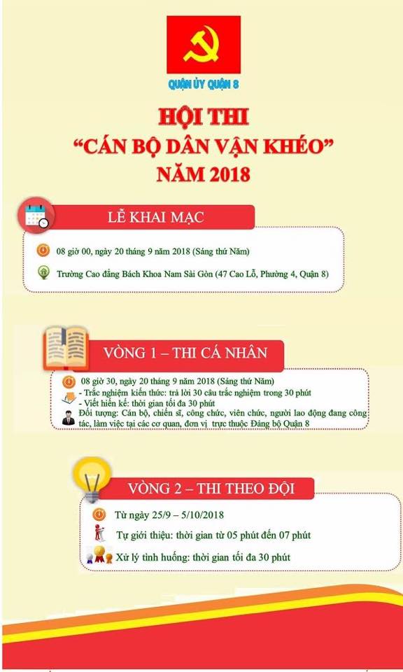 Nhằm tiếp tục đổi mới nội dung, phương thức, nâng cao hiệu quả công tác dân vận và thực hiện thắng lợi Nghị quyết Đại hội Đảng bộ Thành phố lần thứ X, Đại hội Đảng bộ Quận lần thứ XI, các nghị quyết, chỉ thị của Đảng về công tác dân vận. Ngày 20/9, Quận ủy Quận 8 sẽ tổ chức Hội thi “Cán bộ Dân vận khéo” với yêu cầu chu đáo trang trọng, chất lượng, hiệu quả, tạo không khí thi đua sôi nổi góp phần thực hiện tốt các phong trào thi đua của từng địa phương, cơ quan, đơn vị với sự đăng ký tham gia của 153 thí sinh đến từ các cơ sở Đảng trực thuộc Đảng bộ Quận 8.