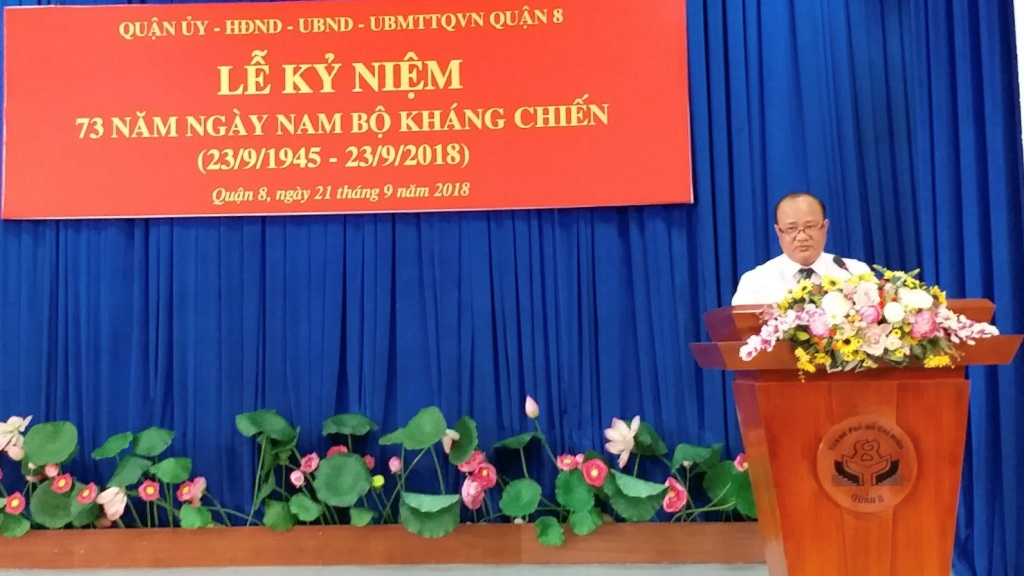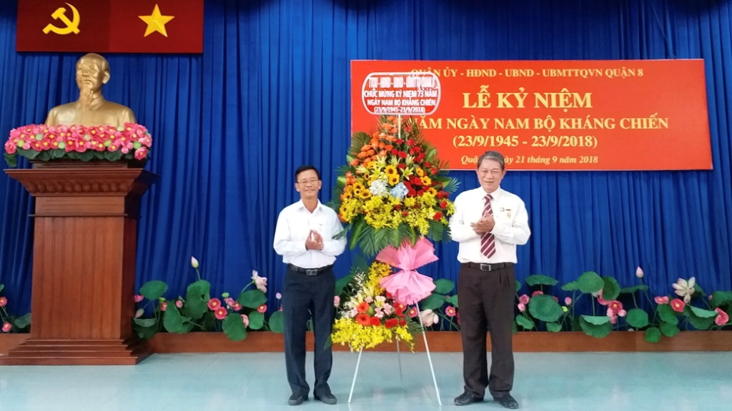 Sáng ngày 21/9, Quận ủy - Hội đồng nhân dân - Ủy ban nhân dân - Ủy ban Mặt trận Tổ quốc Việt Nam Quận 8 long trọng tổ chức họp mặt nhân kỷ niệm 73 năm ngày Nam Bộ kháng chiến (23/9/1945-23/9/2018). Đây cũng là dịp Kỷ niệm ngày truyền thống của Câu lạc bộ Truyền thống kháng chiến Thành phố Hồ Chí Minh. Đến dự buổi họp mặt có các đồng chí Đỗ Hữu Trí – Phó Bí thư Thường trực Quận ủy; Trần Quang Thảo – Phó Bí thư Quận ủy, Chủ tịch Ủy ban nhân dân Quận; lãnh đạo các ban ngành, đoàn thể và các hội viên tiêu biểu Câu lạc bộ truyền thống kháng chiến 16 phường.