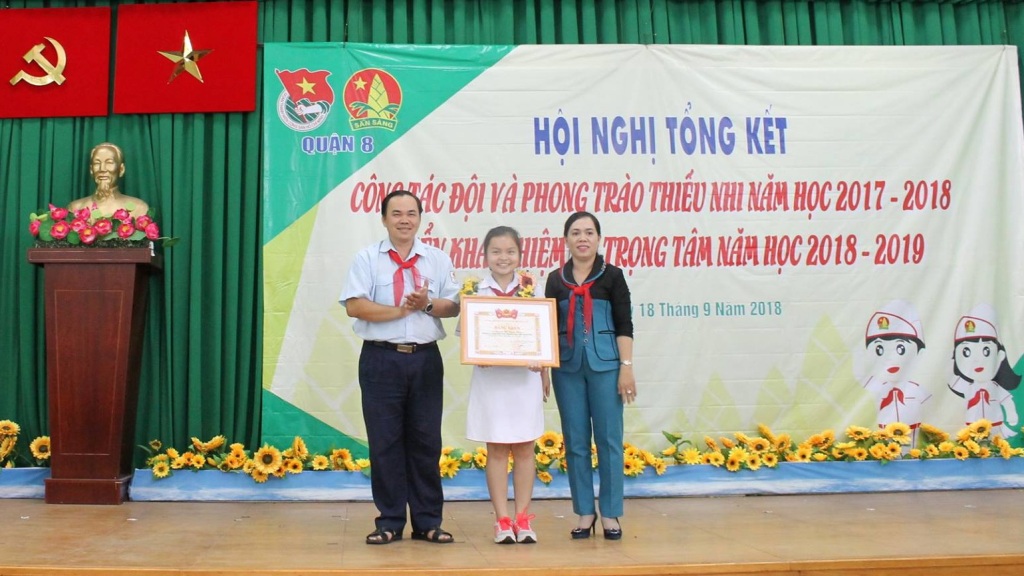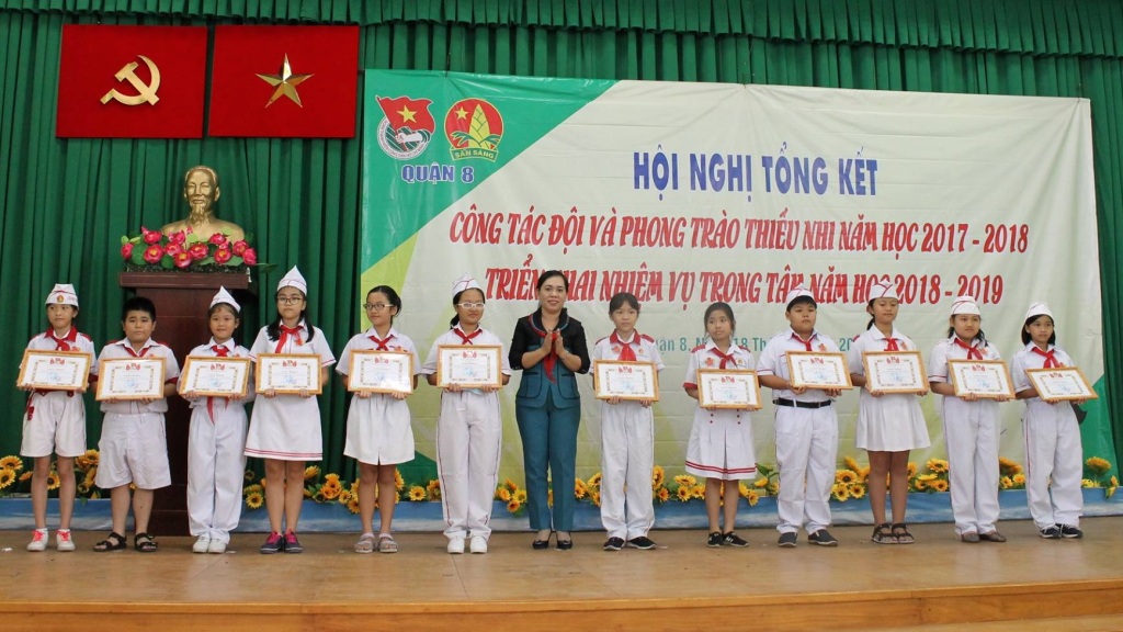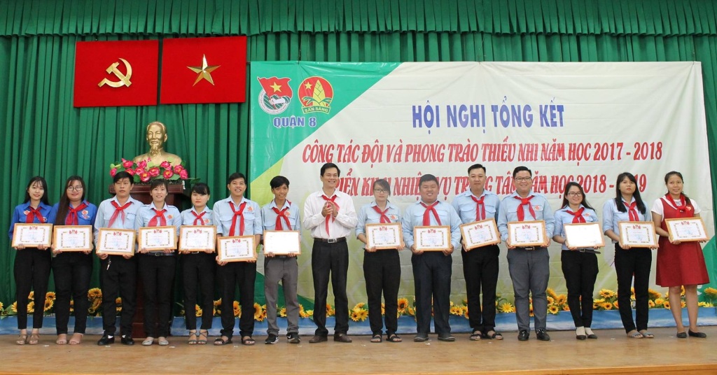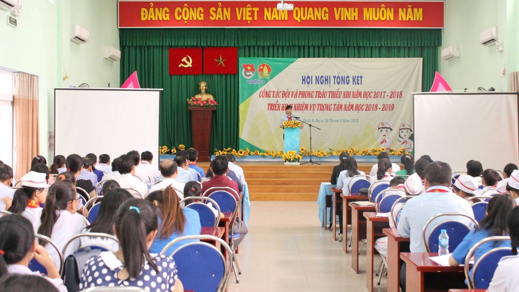 Sáng ngày 18/9/2018, tại Hội trường Quận Đoàn 8 đã diễn ra Hội nghị tổng kết công tác Đội và phong trào thiếu nhi năm học 2017 – 2018, triển khai nhiệm vụ trọng tâm năm học 2018 - 2019. Tham dự hội nghị có đ/c Nguyễn Trọng Nghĩa – Phó Ban Thiếu nhi Thành Đoàn, Chánh văn phòng Hội đồng Đội Thành phố; đ/c Nguyễn Đăng Khoa - Phó Chánh Văn phòng Thành Đoàn; đ/c Nguyễn Thanh Xuân – Phó Bí thư Quận ủy Quận 8; Đ/c Phạm Ngọc Muôn – UVBTV, trưởng Ban Dân vận Quận ủy; Đ/c Nguyễn Thanh Sang - QUV, Phó Chủ tịch UBND Quận 8; đ/c Nguyễn Quốc Hưng - Phó Trưởng phòng Giáo dục & đào tạo Quận 8; đ/c Lương Hoàng Bích Trâm – Bí thư Quận Đoàn, Chủ tịch Hội đồng Đội Quận 8 cùng các đồng chí lãnh đạo các ban ngành, đoàn thể; đại diện Ban giám hiệu, tổng phụ trách Đội, và hơn 150 em đội viên đại diện cho 33 Liên đội trong toàn Quận.