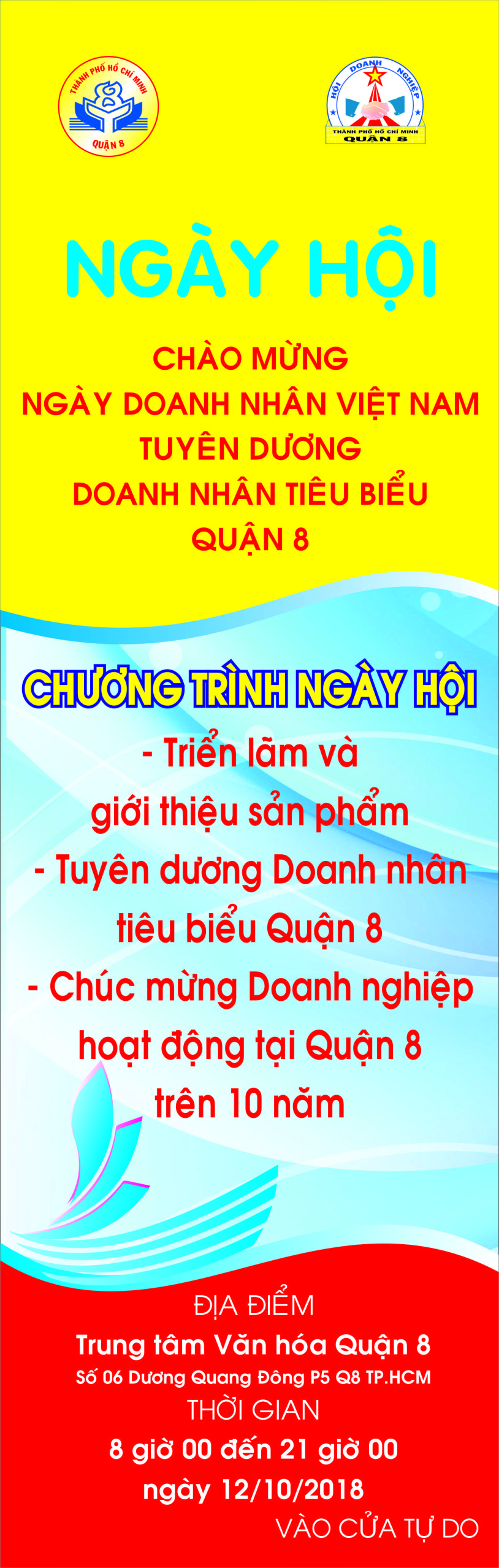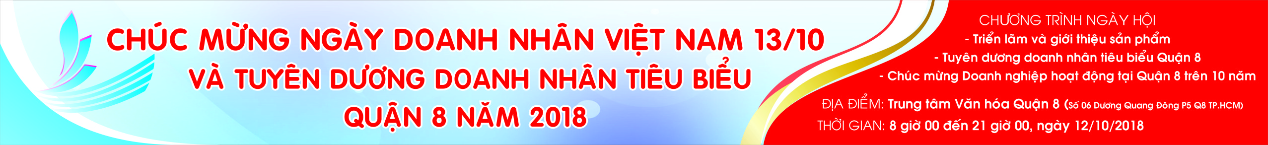 Sáng ngày 12/10/2018 (thứ sáu) sẽ diễn ra Ngày hội chào mừng Ngày Doanh nhân Việt Nam tại Trung tâm văn hóa Quận 8 (số 06 Dương Quang Đông phường 5 Quận 8)