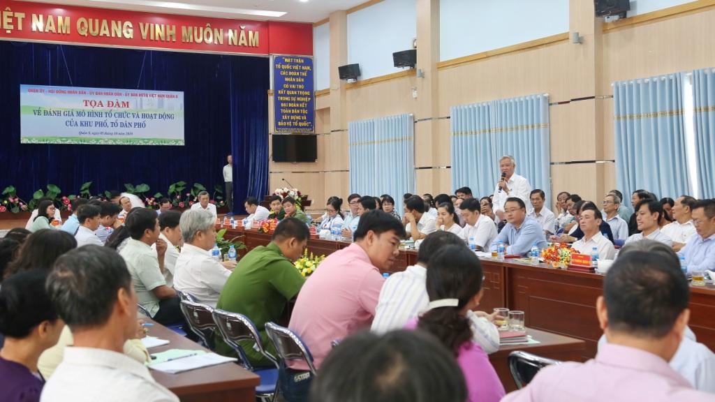 Sáng 12/10/2018, Quận 8 tổ chức Tọa đàm về đánh giá mô hình tổ chức và hoạt động của khu phố, tổ dân phố. Đến dự buổi tọa đàm có đồng chí Nguyễn Văn Hiếu – Ủy viên dự khuyết Ban Chấp hành Trung ương Đảng, Ủy viên Ban Thường vụ Thành ủy, Chủ nhiệm Ủy ban Kiểm tra Thành ủy; đồng chí Hồ Dũng Mân – Phó Trưởng phòng xây dựng chính quyền Sở Nội vụ; đồng chí Đỗ Hữu Trí – Phó Bí thư Thường trực Quận ủy; đồng chí Trương Hạ Long – QUV, Phó Chủ tịch Ủy ban nhân dân Quận 8; cùng các đồng chí đại diện lãnh đạo các ban Quận ủy, Mặt trận Tổ quốc và các đoàn thể quận, Ban Chỉ huy Công an, Quân sự Quận, các phòng ban chuyên môn thuộc quận, Trung tâm văn hóa, Bí thư Đảng ủy – Chủ tịch Hội đồng nhân dân – Chủ tịch ủy ban nhân dân – Chủ tịch Ủy ban Mặt trận Tổ quốc; Trưởng Công an 16 phường, Bí thư Chi bộ - Trưởng Ban điều hành 97 khu phố và đại diện các tổ dân phố trên địa bàn quận.