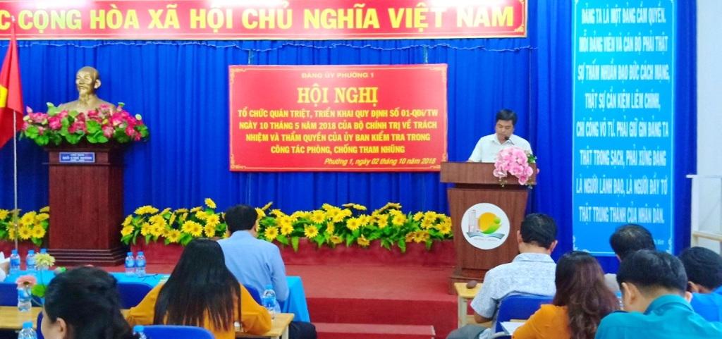 Để nắm vững nguyên tắc thực hiện, trách nhiệm và thẩm quyền của Uỷ ban kiểm tra trong phòng ngừa và phát hiện tham nhũng; nâng cao nhận thức cho cán bộ, đảng viên, hội viên phát huy tính tiên phong, gương mẫu và thực hiện tốt công tác kiểm tra giám sát tại phường; sáng ngày 02 tháng 10 năm 2018 tại Hội trường UBND phường; Đảng ủy Phường 1 tổ chức Hội nghị Quán triệt, triển khai Quy định số 01-QĐ/TW ngày 10 tháng 5 năm 2018 của Bộ Chính trị; đến tham dự buổi quán triệt về phía lãnh đạo phường có ông về phía phường có sự hiện diện của ông Nguyễn Văn Đại - Phó bí thư Thường trực Đảng ủy đồng thời là báo cáo viên của Hội nghị; bà Võ Thị Bích Ngọc – Đảng ủy viên – Phó chủ tịch HĐND phường; ông Nguyễn Thanh Hiệp – Đảng ủy viên – Phó chủ tịch UBND phường; bà Hoàng Thị Hải Vi – Đảng uỷ viên - Chủ tịch Uỷ ban Mặt trận Tổ quốc Việt Nam Phường 1; cùng toàn thể cán bộ công chức phường; cấp ủy 11 chi bộ, công an và lực lương dân quân phường cùng đến tham dự Hội nghị./.