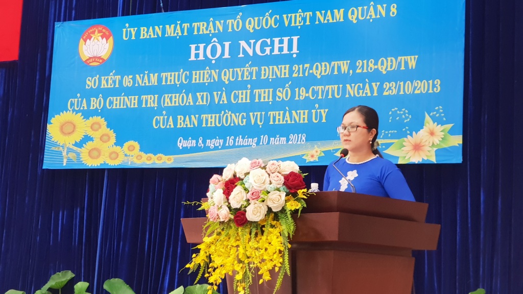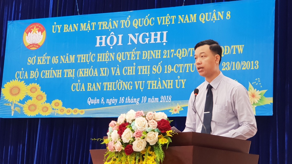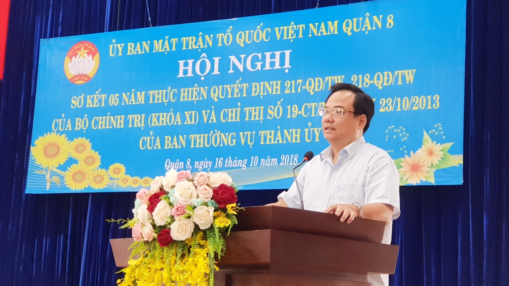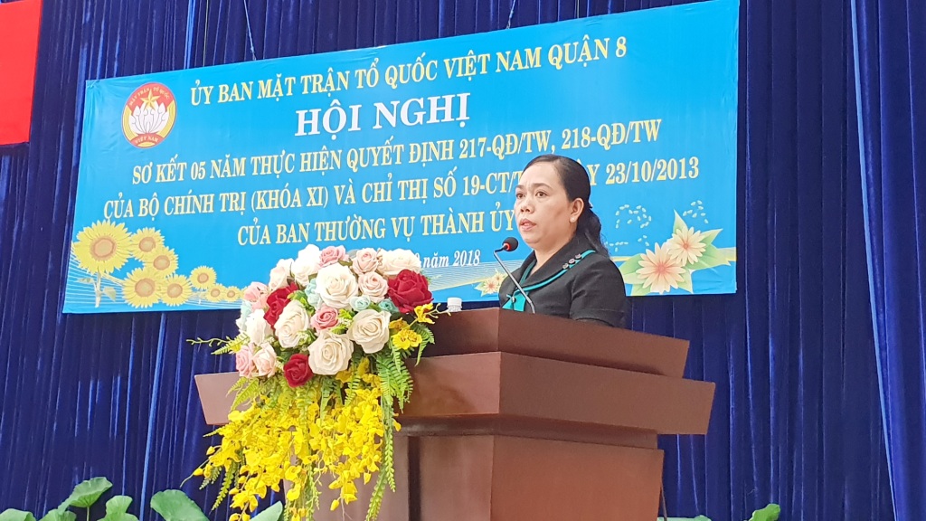 Hội nghị đã nghe đại diện Ban Thường trực Ủy ban Mặt trận Tổ quốc Việt Nam Quận 8 thông qua báo cáo tóm tắt kết quả 05 năm thực hiện thực hiện Quyết định số 217-QĐ/TW, 218-QĐ/TW của Bộ Chính trị (khóa XI) và Chỉ thị số 19-CT/TU ngày 23/10/2013 của Ban Thường vụ Thành ủy.