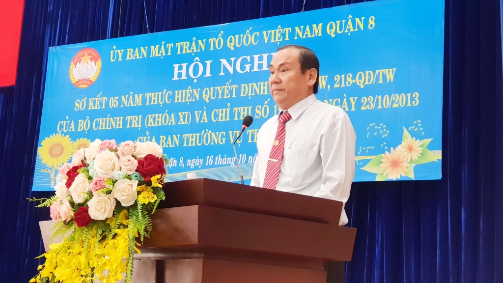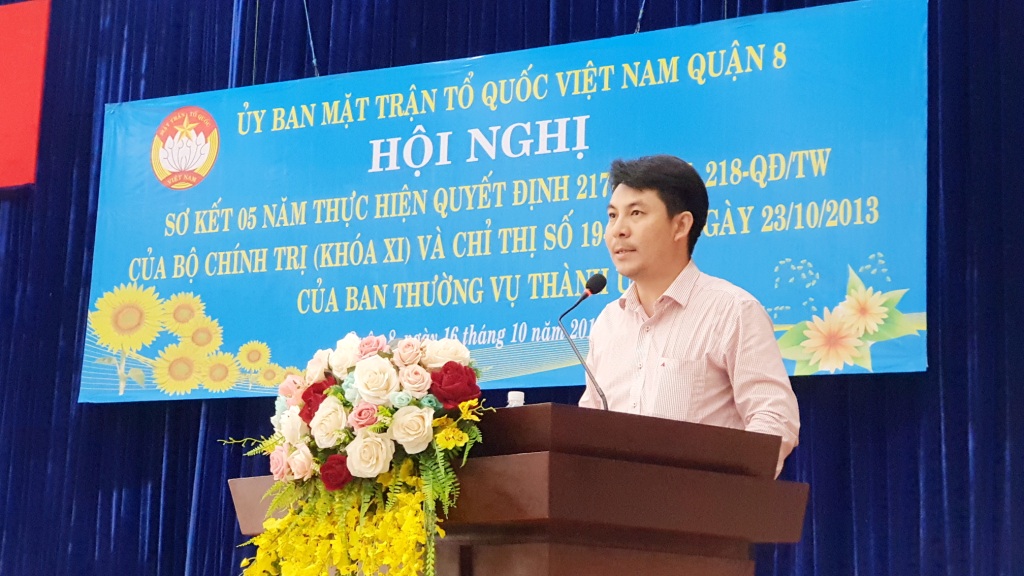 Ông Đinh Chí Thành - Phó Chủ tịch Ủy ban Mặt trận Tổ quốc Việt Nam Quận 8 báo cáo tóm tắt kết quả 05 năm thực hiện thực hiện Quyết định số 217-QĐ/TW, 218-QĐ/TW của Bộ Chính trị (khóa XI) và Chỉ thị số 19-CT/TU ngày 23/10/2013 của Ban Thường vụ Thành ủy.