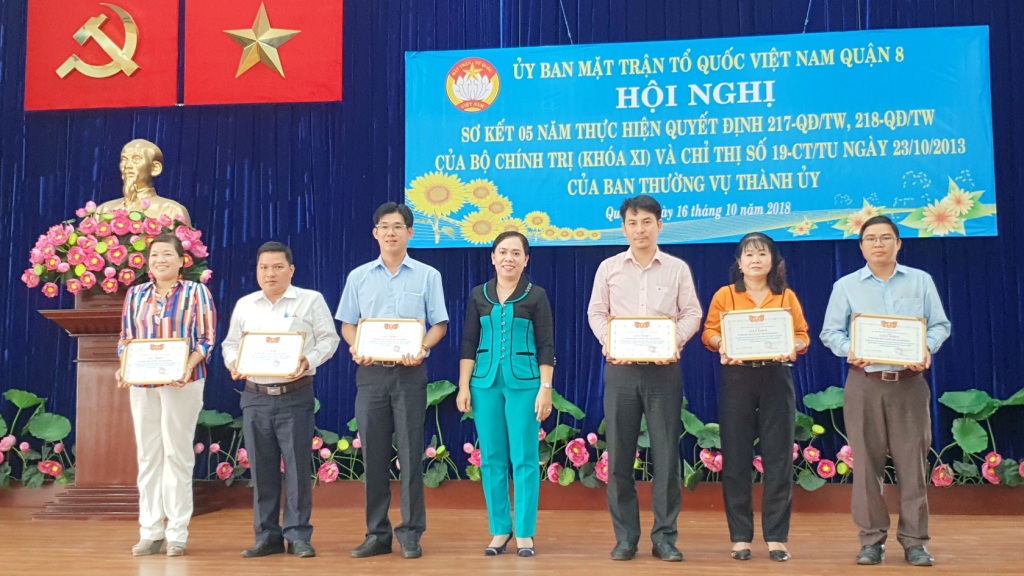 Tại hội nghị, Ban Thường trực Ủy ban Mặt trận Tổ quốc Việt Nam Quận 8 đã biểu dương khen thưởng cho 06 tập thể và 04 cá nhân có thành tích tốt trong 05 năm thực hiện thực hiện Quyết định số 217-QĐ/TW, 218-QĐ/TW của Bộ Chính trị (khóa XI) và Chỉ thị số 19-CT/TU ngày 23/10/2013 của Ban Thường vụ Thành ủy./.