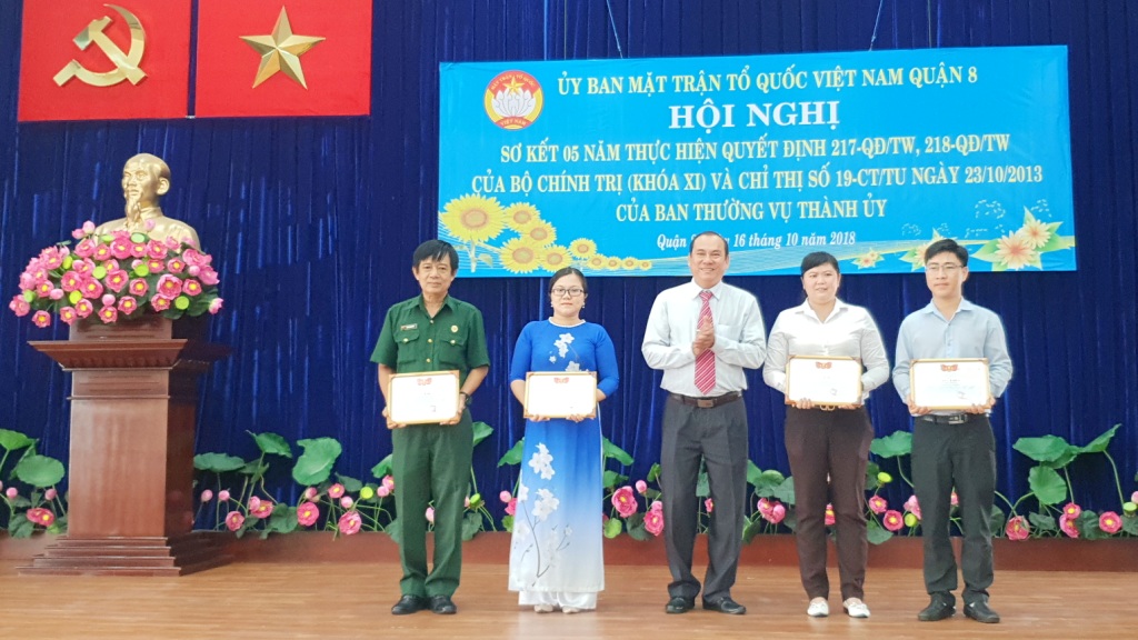 Ông Mai Hồng Phong - Phó Chủ tịch Thường trực Ủy ban Mặt trận Tổ quốc Việt Nam Quận 8 trao tặng giấy khen cho các cá nhân có thành tích tốt trong 05 năm thực hiện thực hiện Quyết định số 217-QĐ/TW, 218-QĐ/TW của Bộ Chính trị (khóa XI) và Chỉ thị số 19-CT/TU ngày 23/10/2013 của Ban Thường vụ Thành ủy.