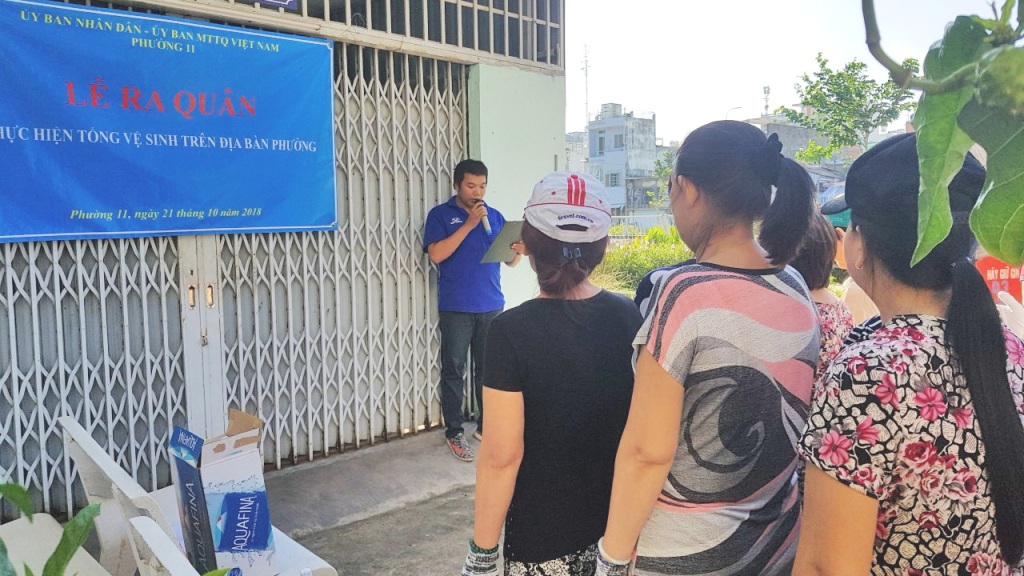 Sáng ngày 21 tháng 10 năm 2018, tại đểm sinh hoạt khu phố 1, Ủy ban nhân dân phối hợp với Ủy ban Mặt trận Tổ quốc Việt Nam Phường 11 đã tổ chức lễ ra quân tổng vệ sinh môi trường trên địa bàn phường (khu vực Rạch Ụ Cây).