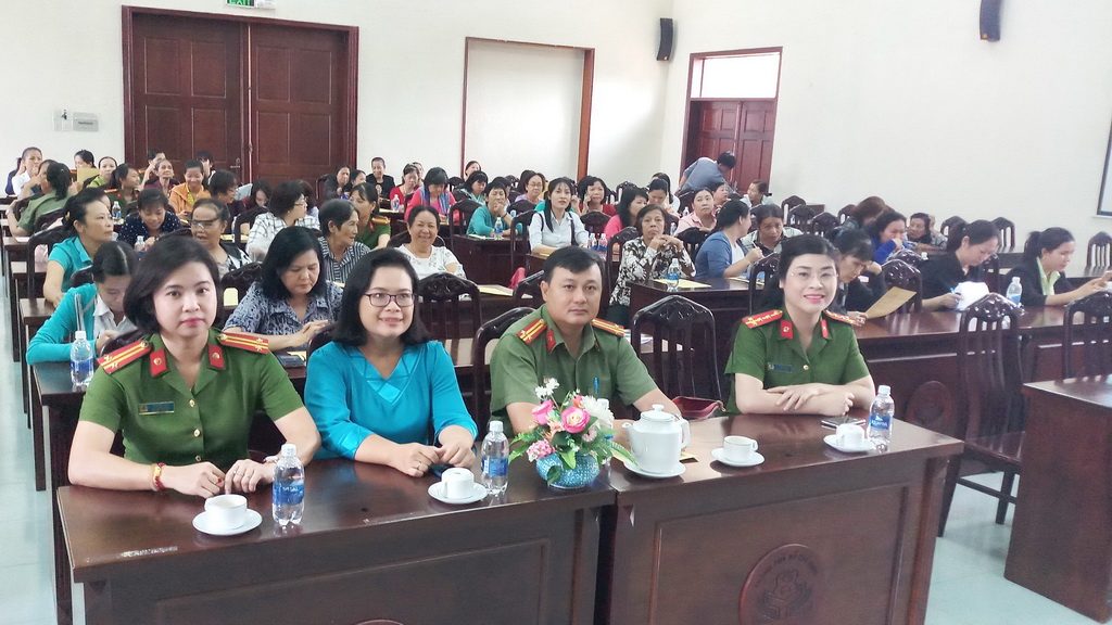 Chị Lâm Việt Anh (trái) dự hội nghị tuyên truyền phòng, chống lừa đảo qua mạng
